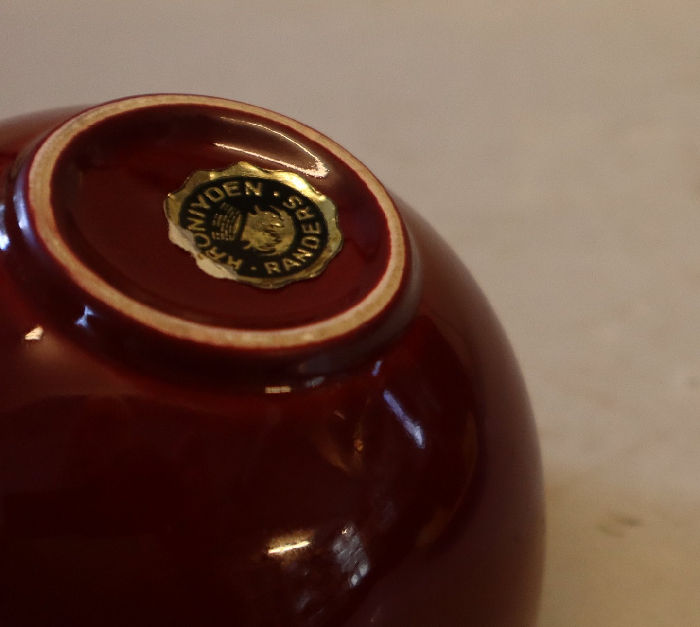 Beskrivelse: Sukkerskål 6.5 x 9.5 cm gul & bordeaux Congo Kronjyden retrostel i gult og rødt. l I fin og hel stand.