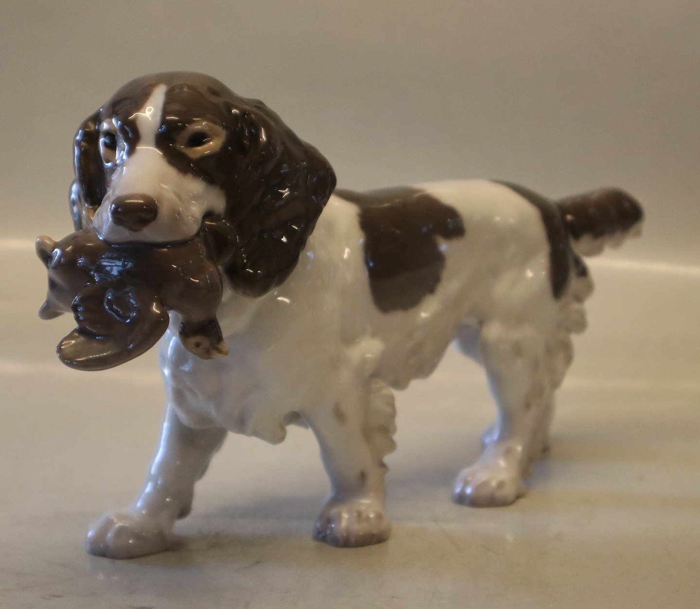 Beskrivelse: Bing & Grøndahl hund 2061 Spaniel med fugl 25 cm Lauritz Jensen arbejde både for Royal Copenhagen, Dahl Jensen og Bing & Groendahl Jagthund
