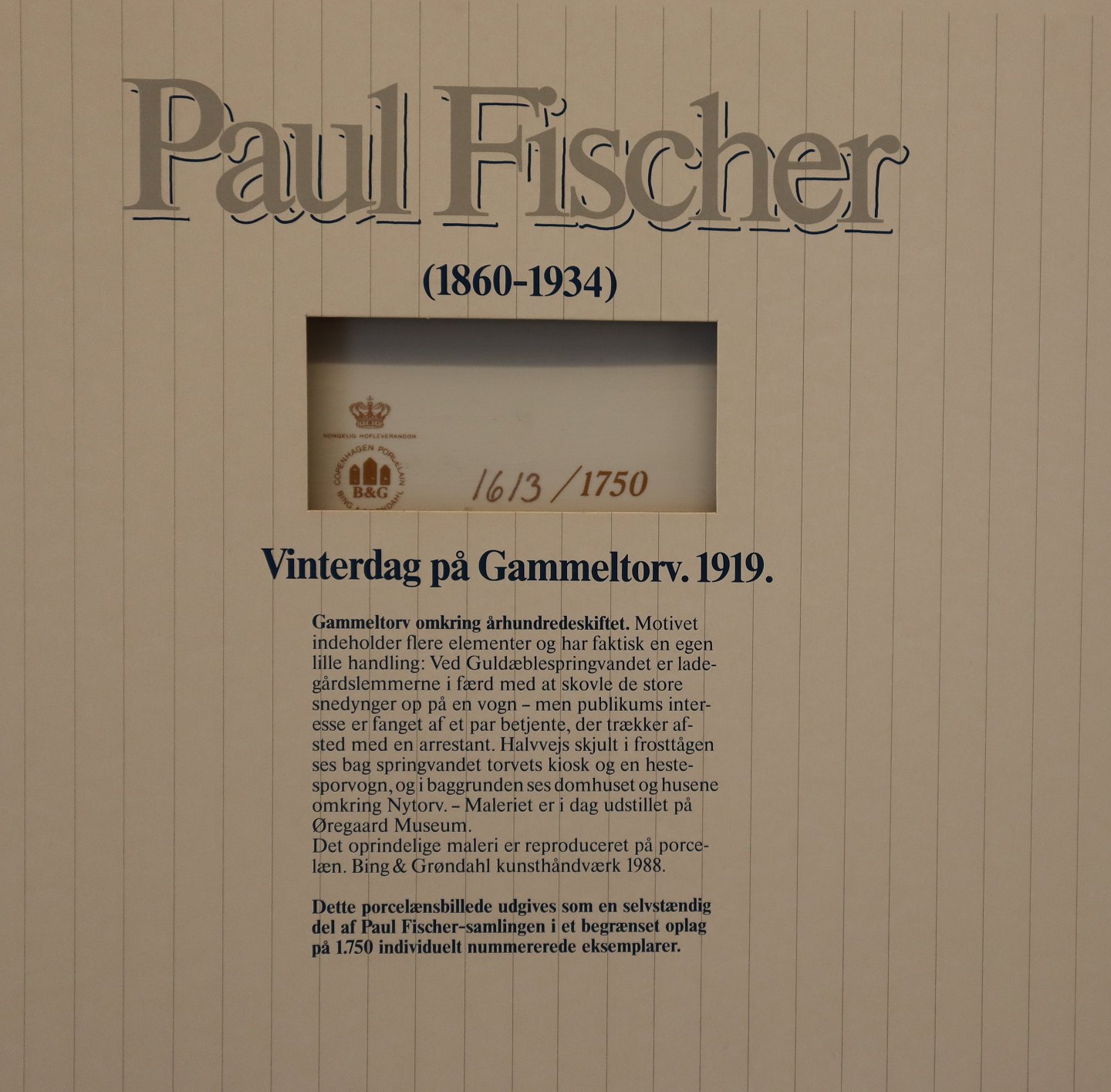 Beskrivelse: Bing & Grøndahl porcelænsmaleri i guldramme33.5 x 47 cm Paul Fisher (1860-1934) Vinterdag på Gammeltorv 1919 No 1613 af 1750
