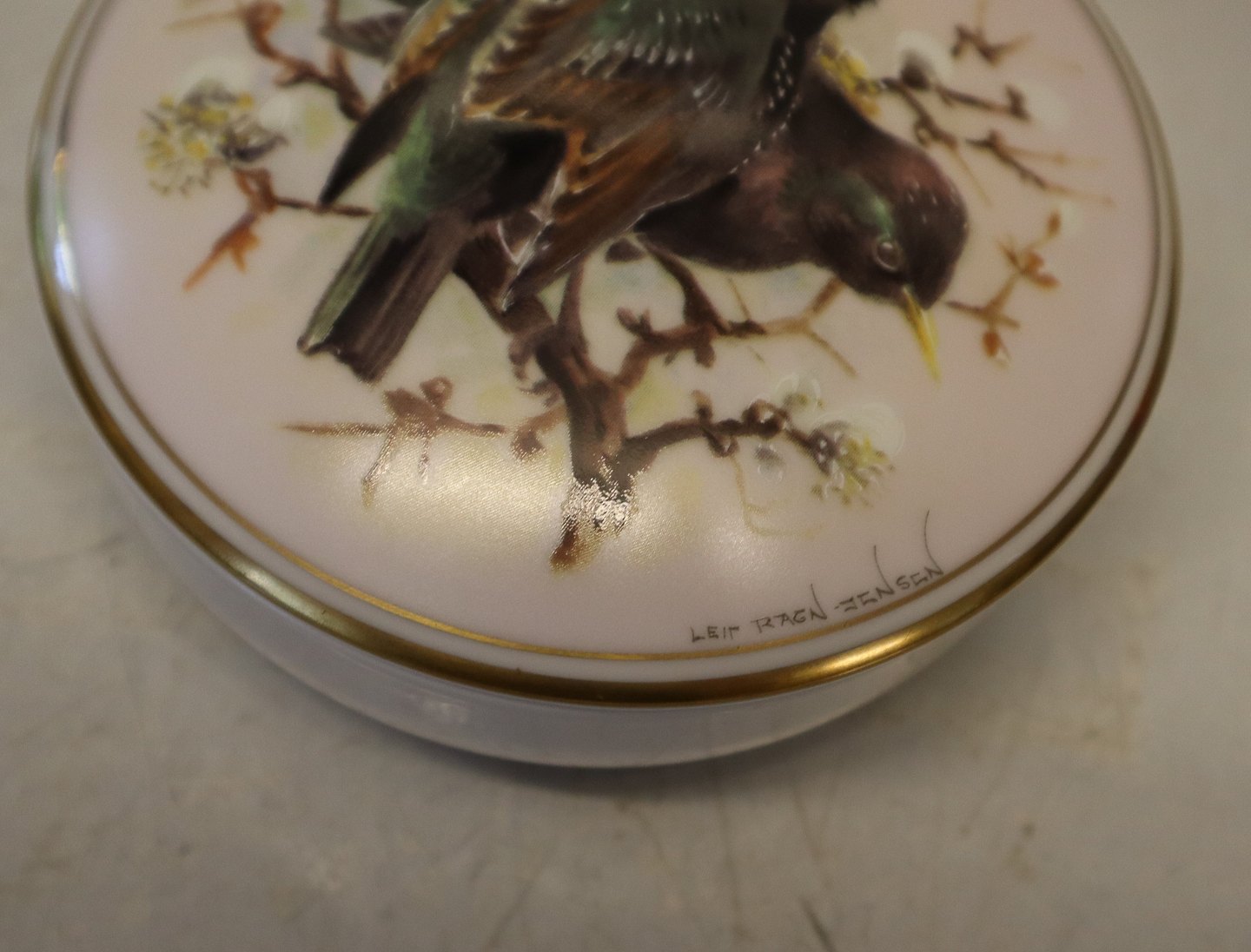B&G 5418 Bonbon Skål med dekoreret låg 5417-1465 Fuglemotiv med stære Leif Ragn Jensen 5 x 12 cm Bing & Grøndahl