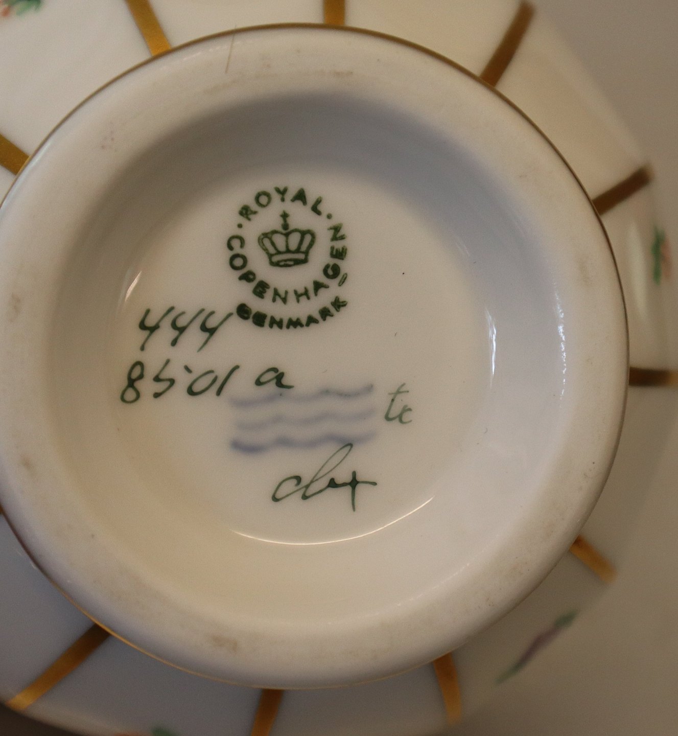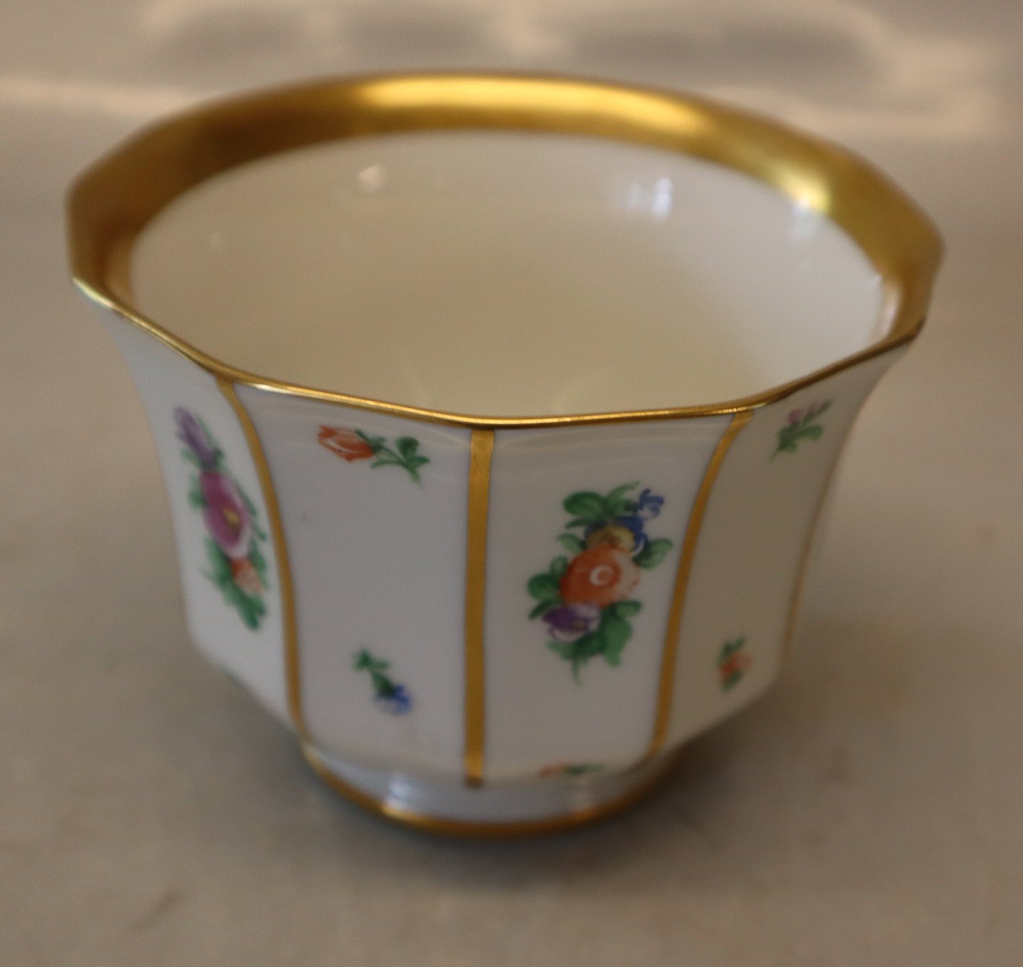 8501-445 a Morgenkop uden hank 8 x 10.5 cm Kgl. Henriette # 444 Håndmalet spise- og kaffestel fra Den kongelige Porcelænsfabrik med strøblomster . I fin og hel stand