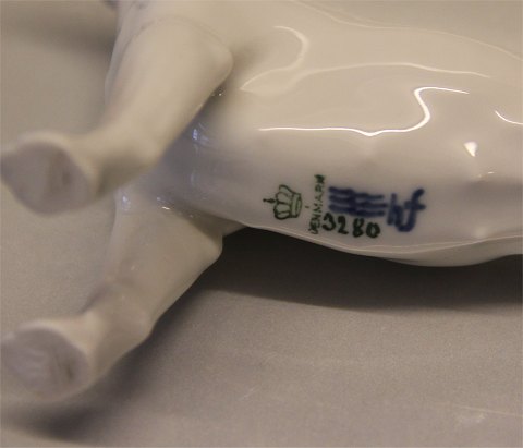 Beskrivelse: Kgl. hundefigur fra Royal Copenhagen 3280 Engelsk bullterrier (Ikke en Pittbull ) Th. Madsen 14 x 20 cm 1. I hel og fin stand