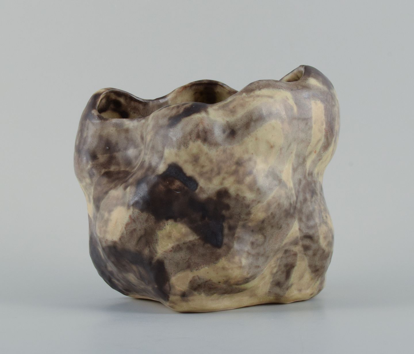 Unique stoneware vase with cream/black matte glaze. Hand modeled, and organically shaped.