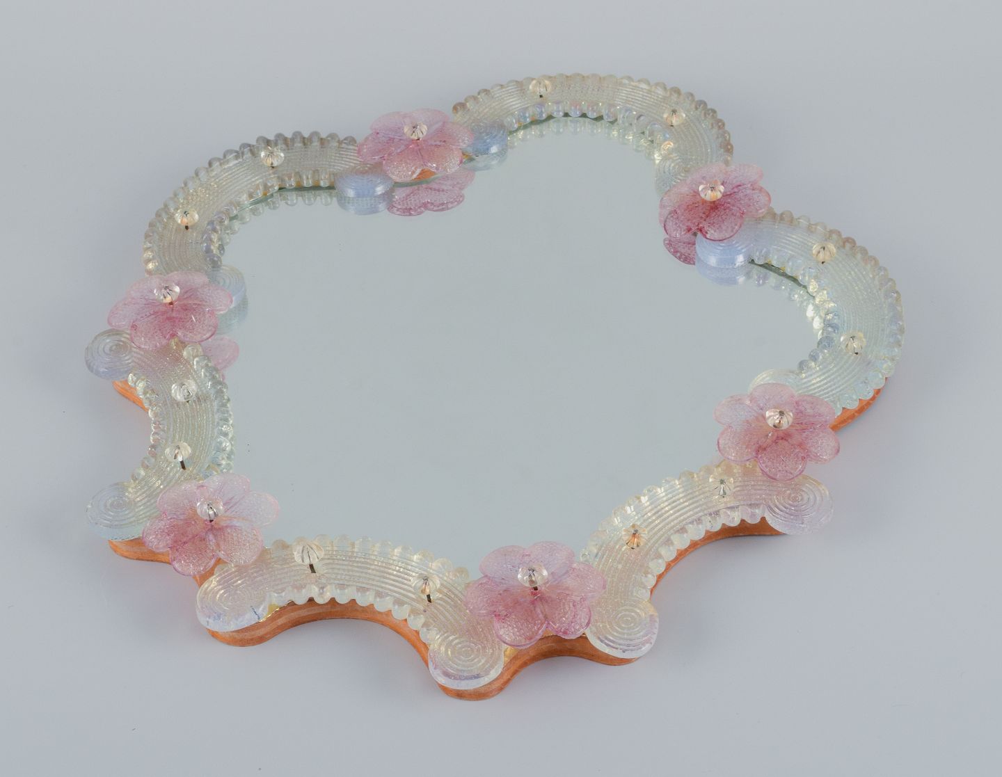 Murano, Venice, adorable mirror in art glass with gold and pink decoration. Approx. 1960/70s. In perfect condition. Dimensions: H 35.0 x W 30.0 cm.