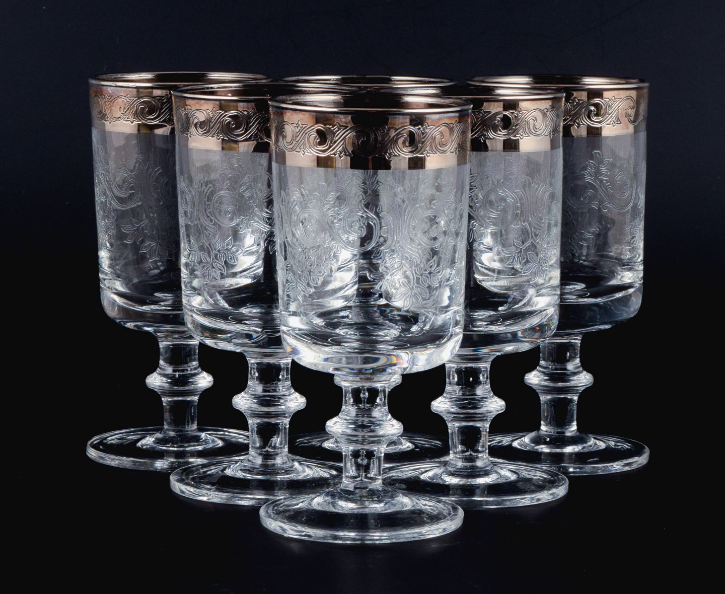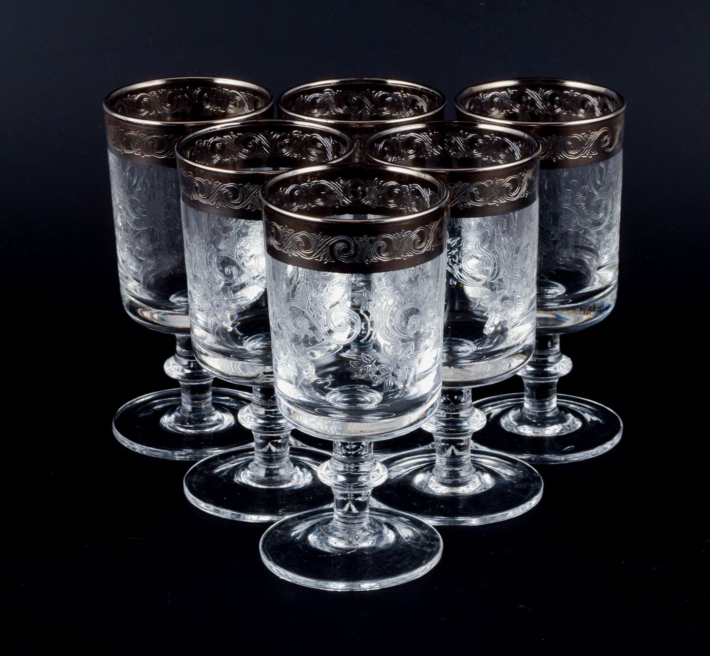 Murano, Italy, six mouth-blown and engraved dessert wine glasses with silver rim.