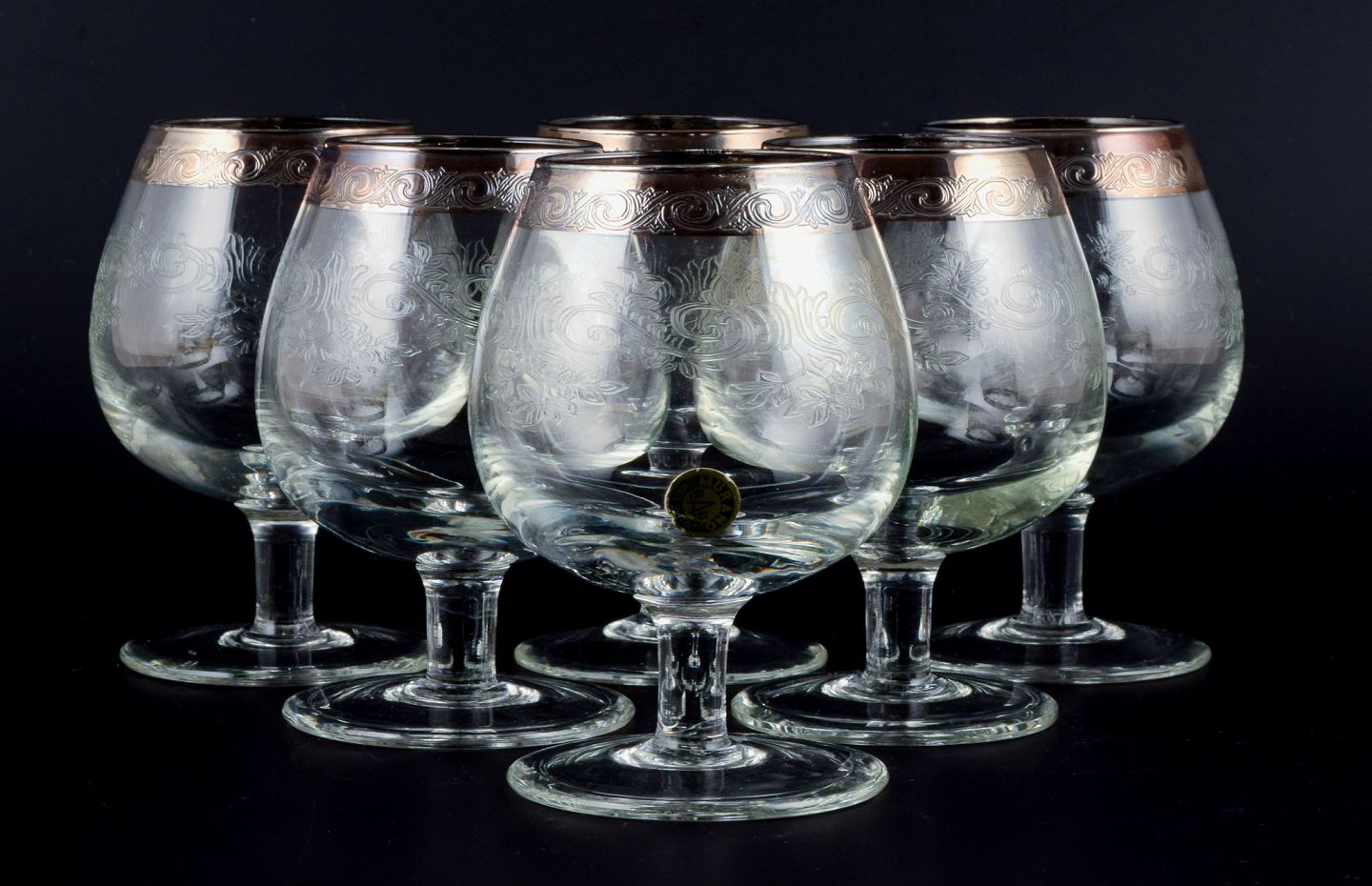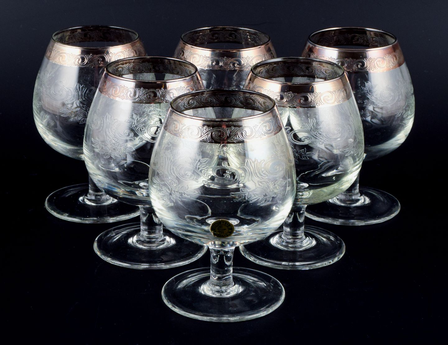 Murano, Italy, six mouth-blown and engraved brandy glasses with silver rim.