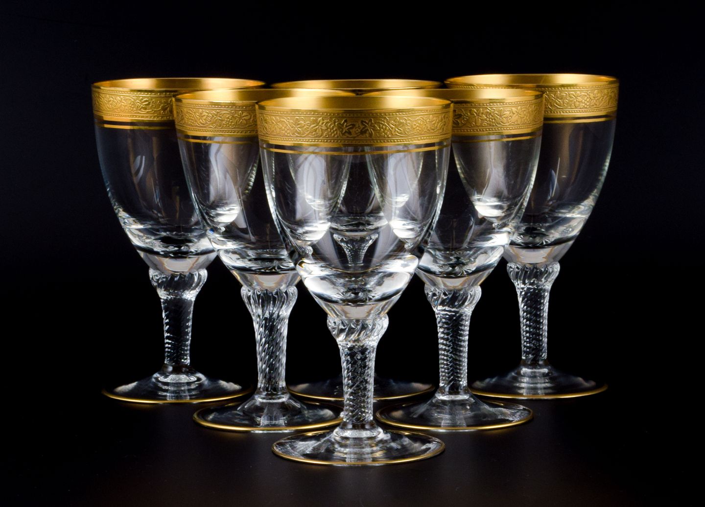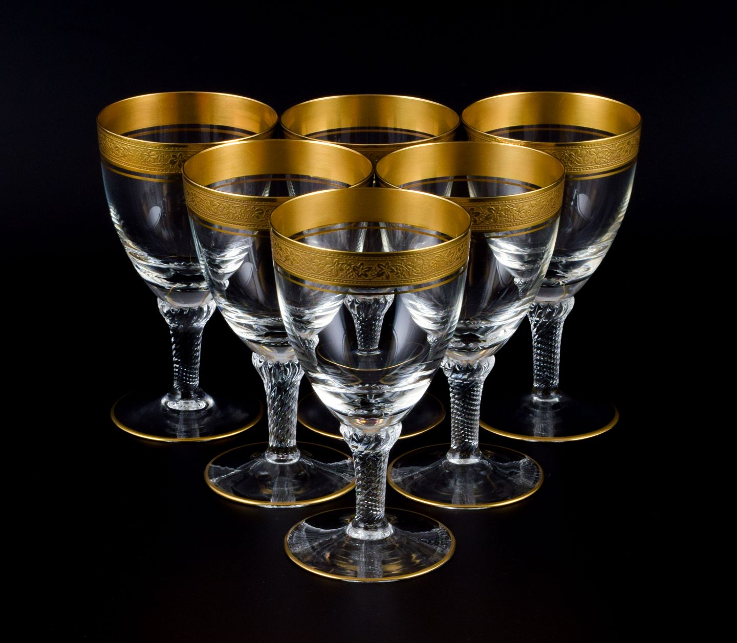 Rimpler Kristall, Zwiesel, Germany, six hand blown crystal red wine glasses with gold rim decorated with grapes and vine leaves.