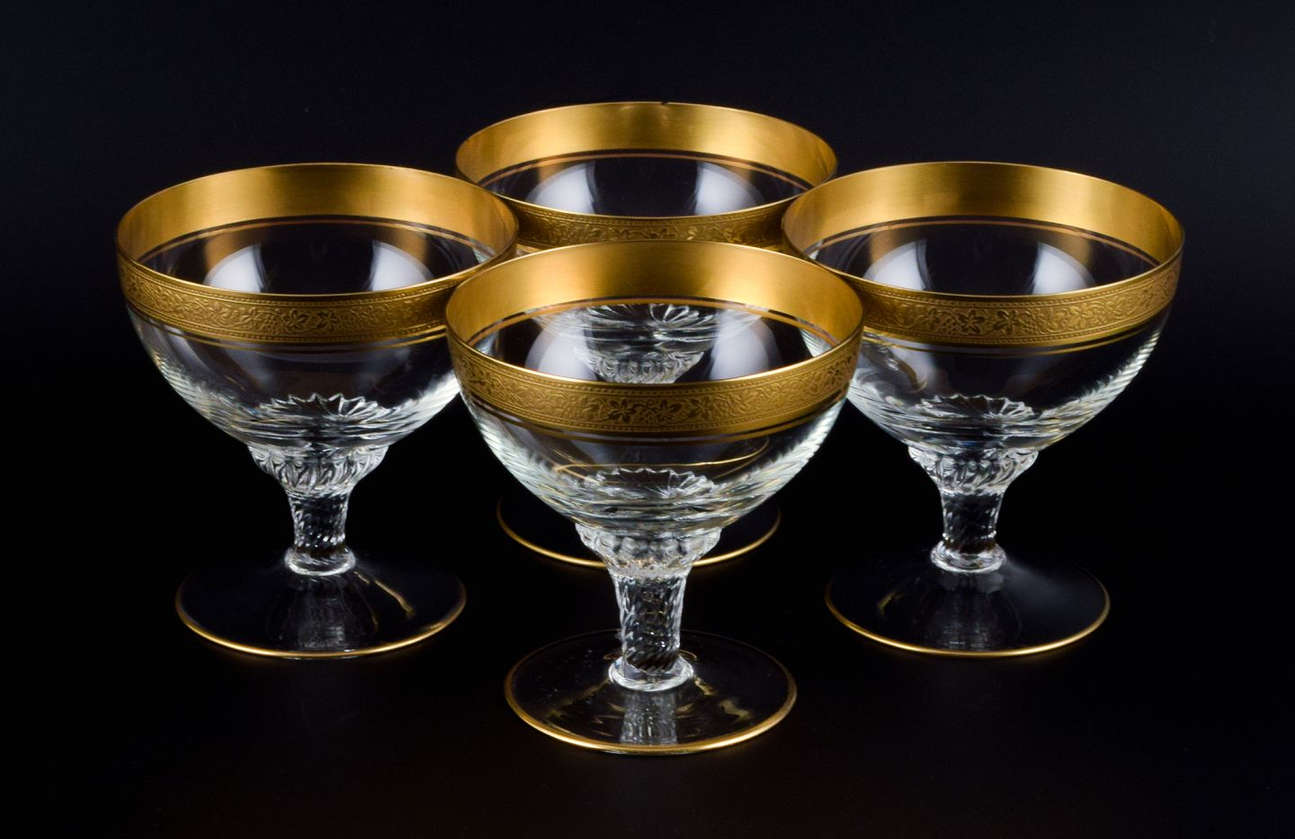 Rimpler Kristall, Zwiesel, Germany, four mouth-blown crystal champagne glasses with gold rim decorated with grapes and vine leaves. 1960s. In perfect condition. Dimensions: H 10.5 x 10.0 cm.