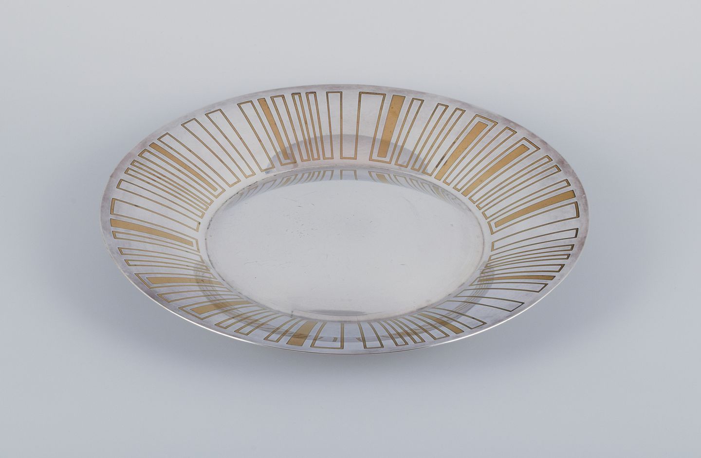 WMF, Germany. Large "Ikora" Art Deco bowl with three feet, silver-plated with brass inlay.