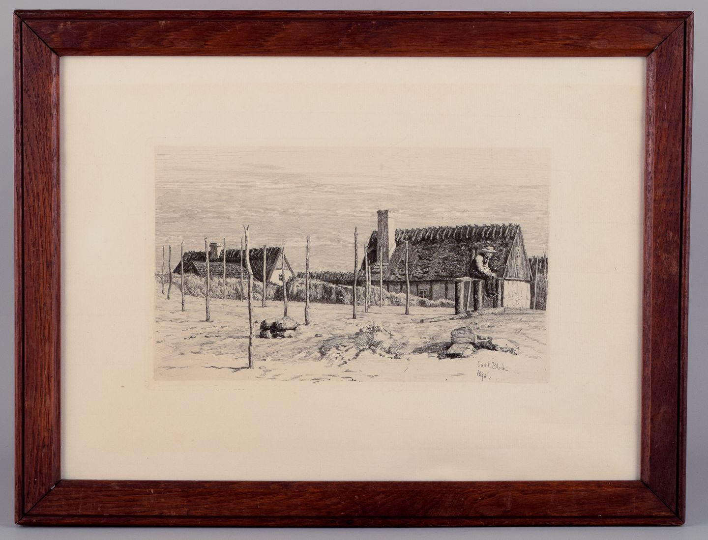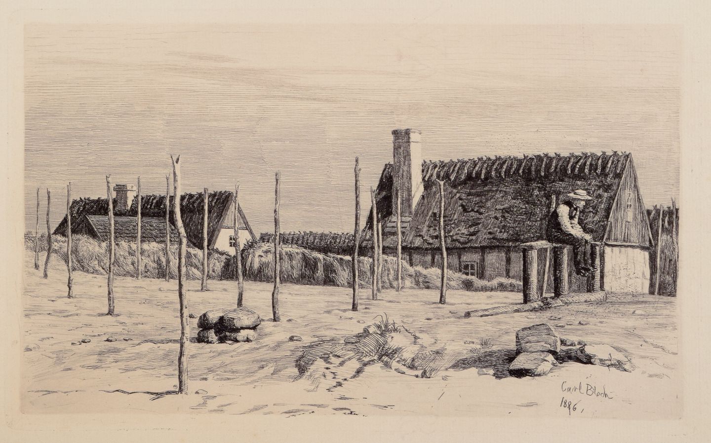 Carl Bloch (1834–1890). Etching of a seated fisherman with thatched houses in the background.
