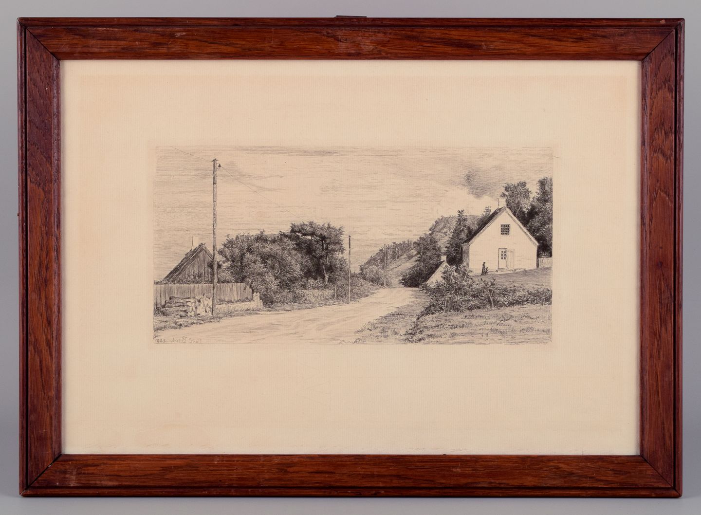 Carl Bloch (1834–1890). Etching. Houses by the road. Dated 1883. In perfect condition. Signed. Total dimensions: 42.0 cm x 30.5 cm. Antique frame in dark oak.