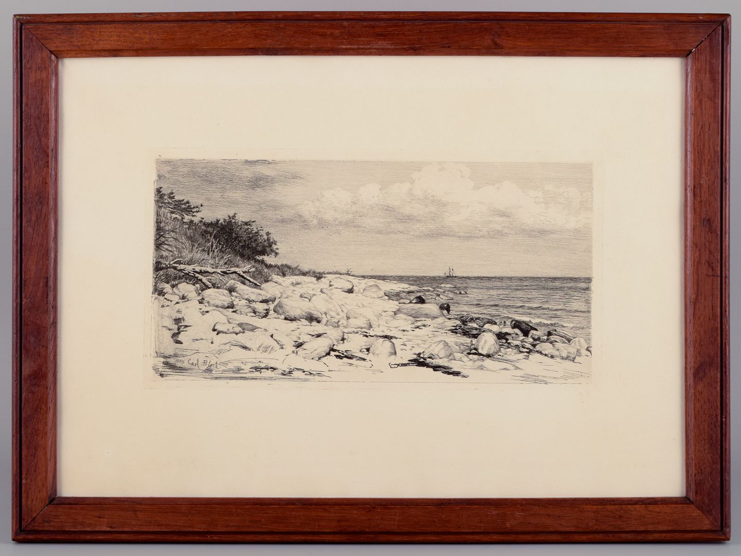 Carl Bloch (1834–1890). Etching of a Danish coastal landscape with a sailboat on the horizon. From the northern coast of Zealand, Hornbæk Plantation.