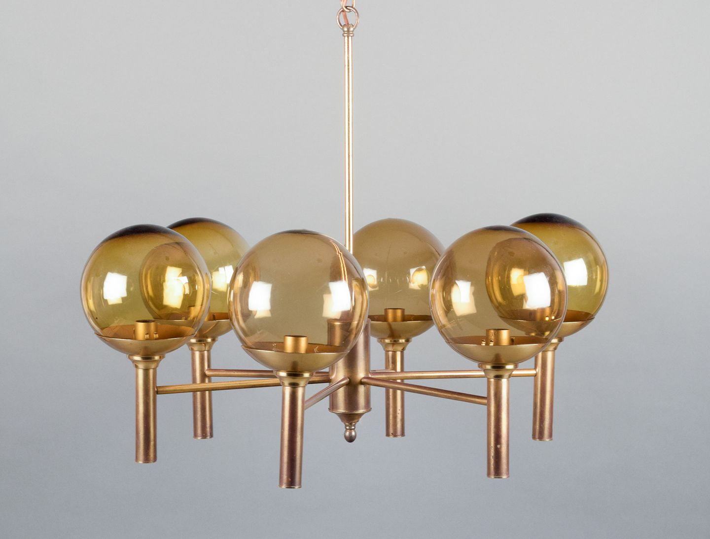 Sv. Mejlstrøm, Danish designer. Brass chandelier with six arms and dome-shaped shades made of amber-colored glass.