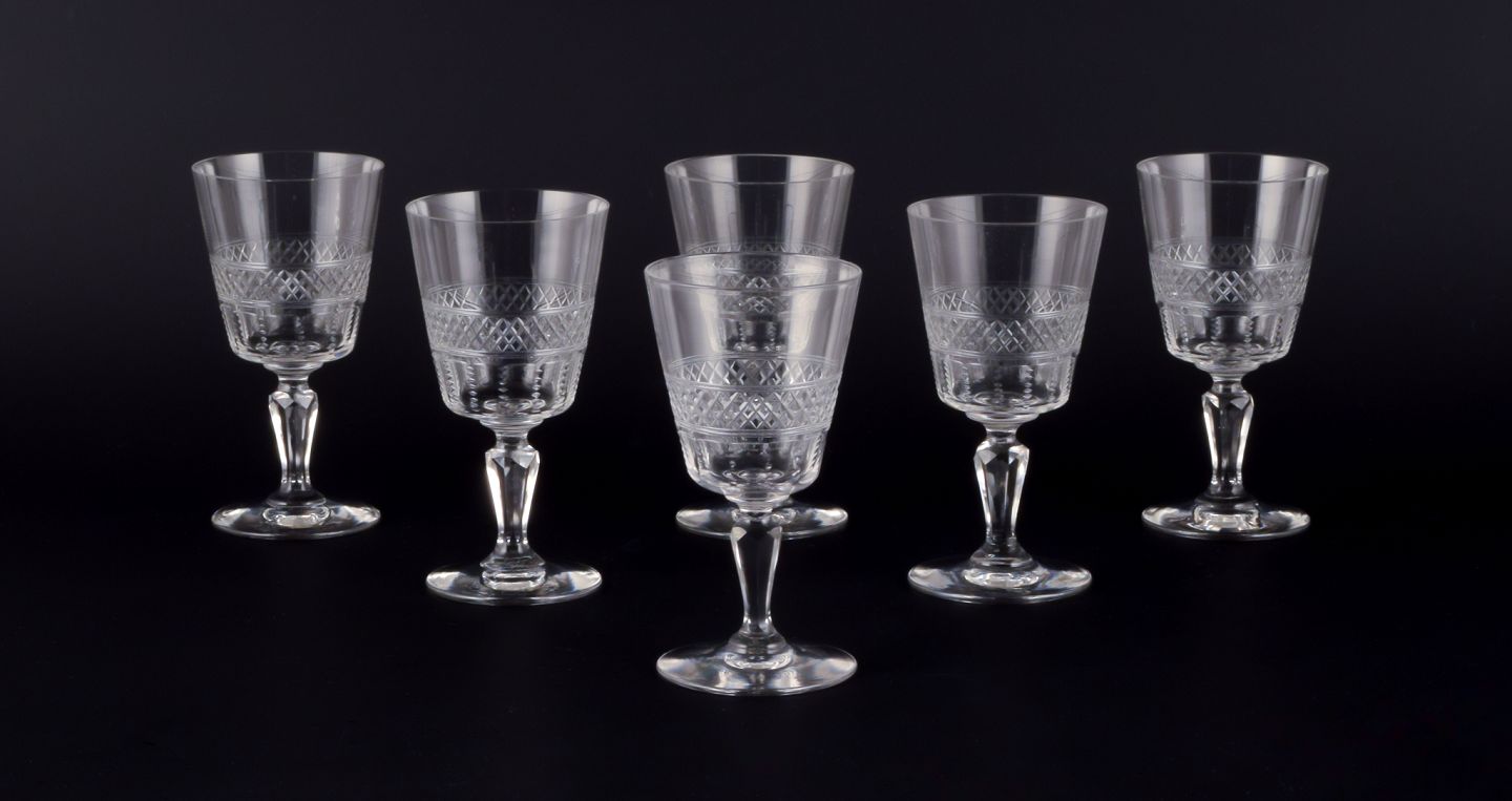 A set of six mouth-blown French white wine glasses in crystal glass. Faceted cut. Handmade. Circa 1900. Perfect condition. Dimensions: D 6.2 cm x H 12.0 cm.