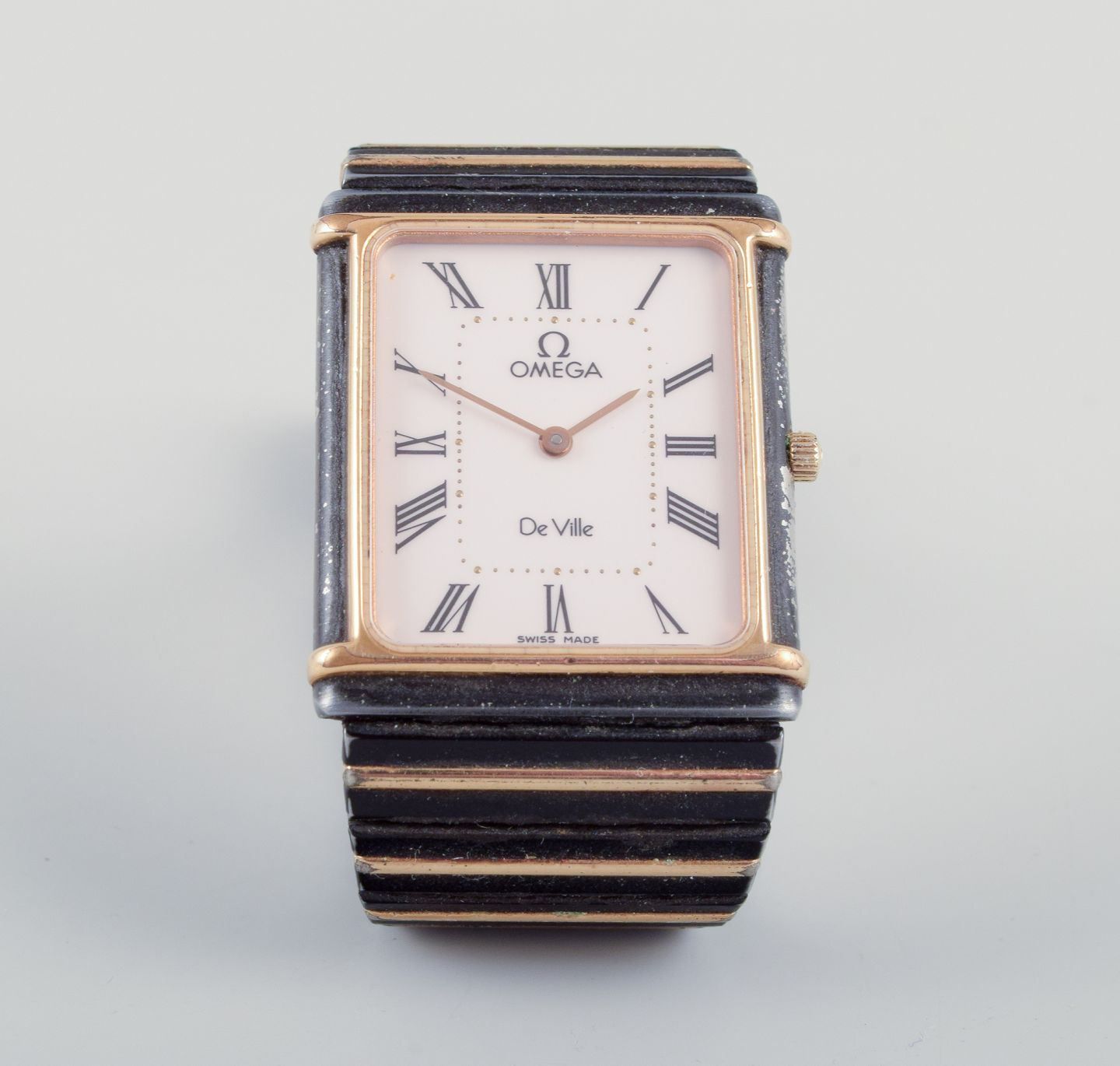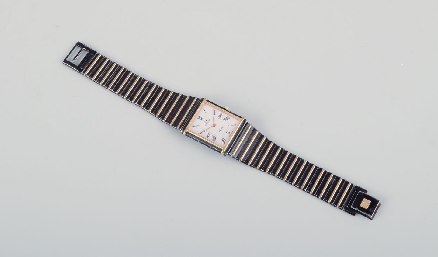 Omega De Ville men's wristwatch in brass and black metal. 1980s. All parts are original. Quartz movement. In perfect condition. The watch requires a battery replacement. Dial: 23 mm.