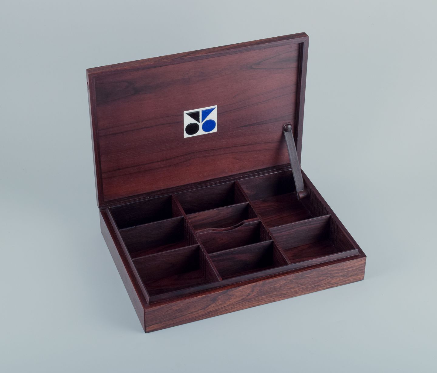 With inlaid enamel work by Maria Viktor, inside the lid.