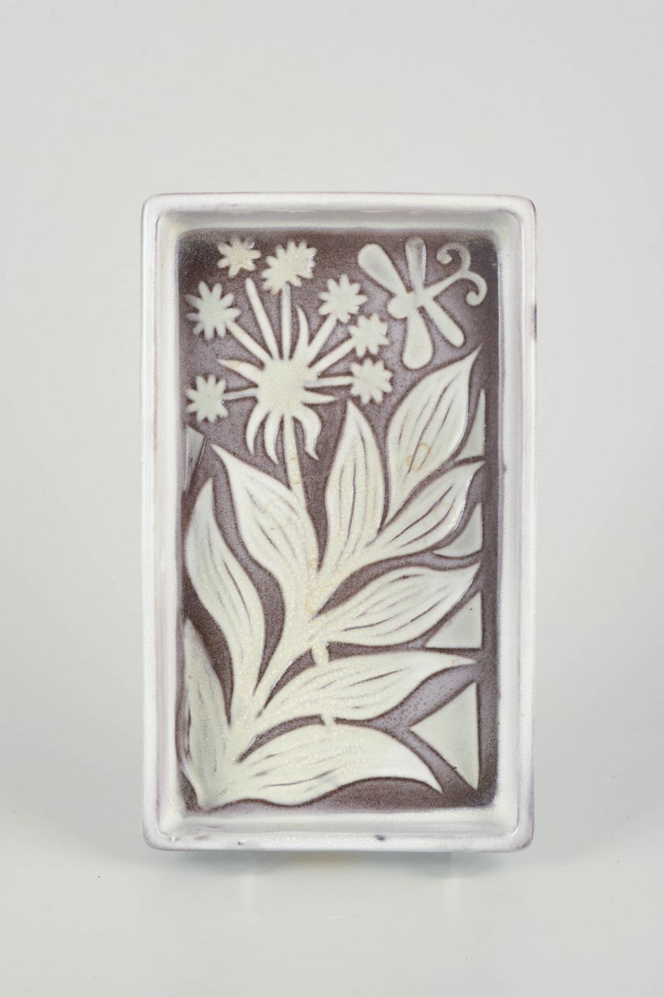 Relief-decorated stoneware with stylised floral and insect motif in white and grey glaze.