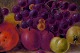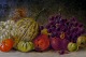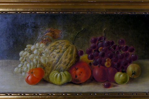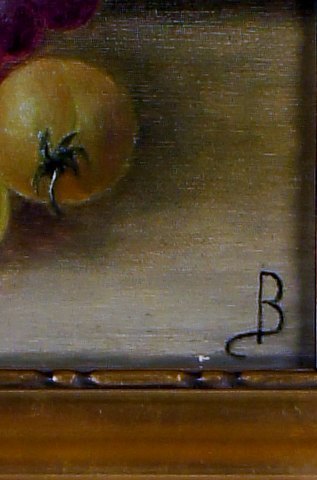 Olie på lærred, opstilling med frugter og grøntsager. Ca. 1900. Monogram "B". Ubekendt maler. I god stand, lærredet måler 51x26 cm. Guldrammen er 6 cm. bred og i god stand.