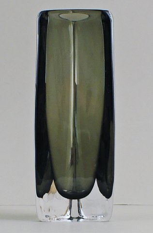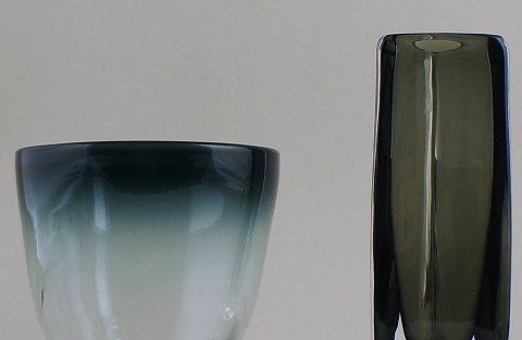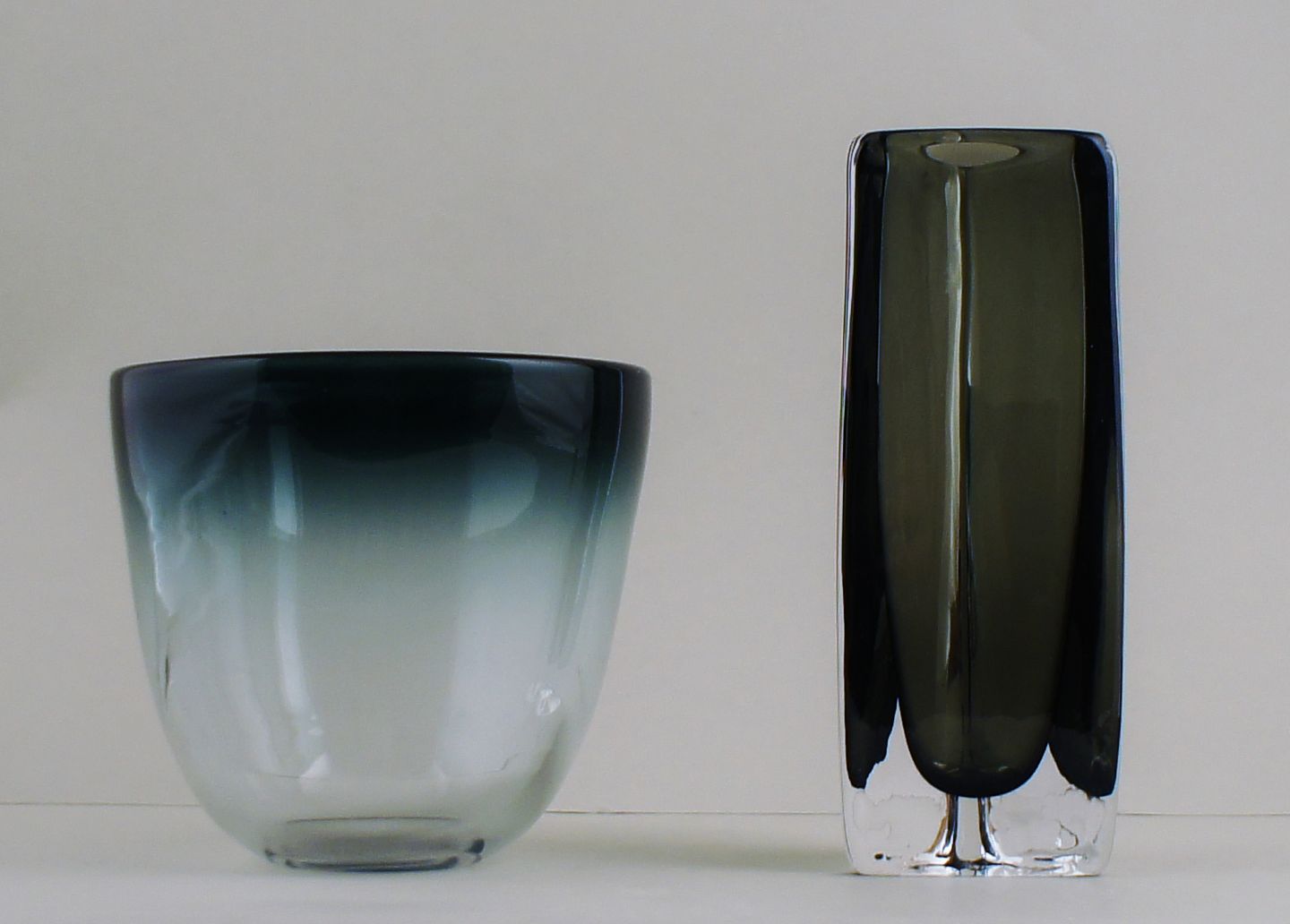 In good condition. 16.5 x 16.5 cm. Smoke colored vase 23.5 cm. high.