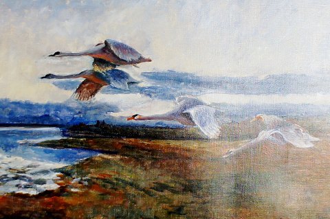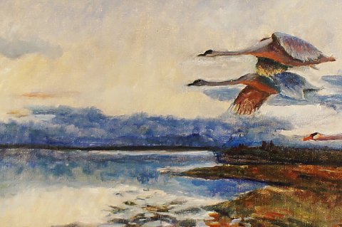 Signeret Bruno Lijlefors 1924. Flyvende svaner i landskab.
