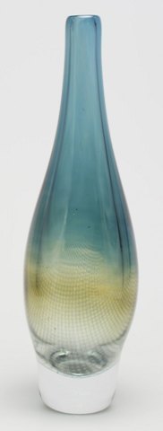 STOR Sven Palmqvist, Orrefors KRAKA kunstglasvase, netmønster i blåt og gulgrønt. Signeret ORREFORS, pu 3364, Sven Palmqvist. I god stand. Højde 33 cm.