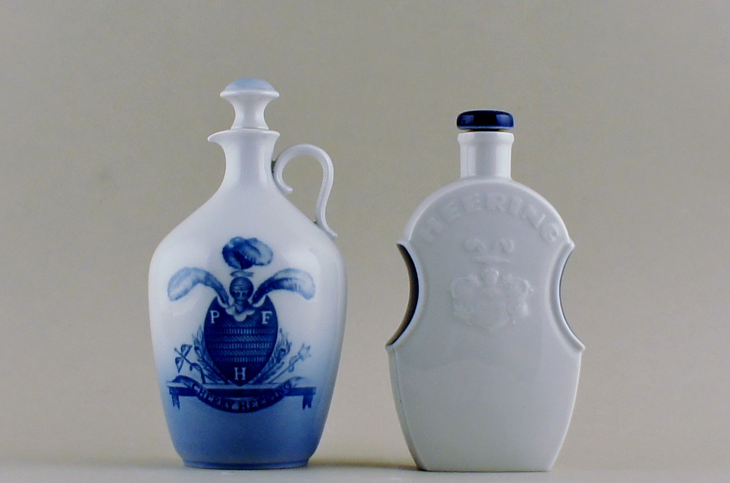 2 B&G (Bing & Grøndahl) og Royal Copenhagen "Heering" brændevinskander med prop. Højeste måler 22 cm. I god stand, B&G dog 2. sortering. Priser : 800 kr. og 1000 kr. for B&G kanden.