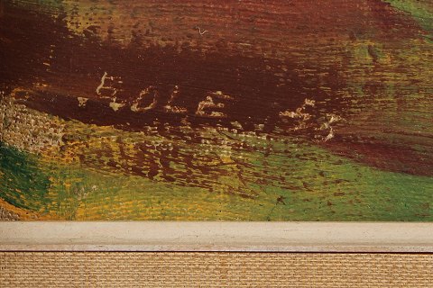 Oliemaleri, Elof Karlsen 1952. Sognefjorden, Kaupanger, Norge. Signeret. Måler : 48x63cm. I god stand.