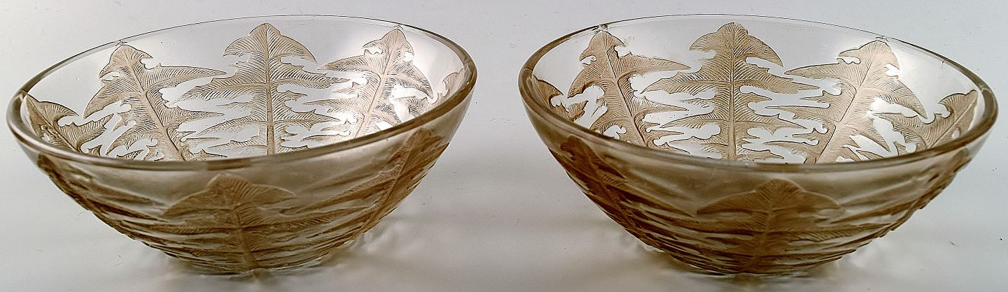 Par tidlige Art deco Lalique kunstglasskåle. Signeret: R. Lalique. 1920/30´erne. Størrelse: 5 cm. høje. 13 cm. i diameter. I perfekt stand.