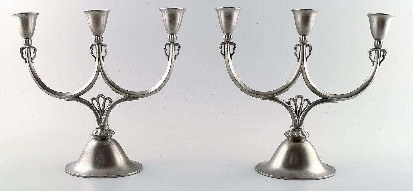 Just Andersen art deco par tin lysestager, nummer 18. Stemplet. Dateret 1929. Fremstår i flot stand. Måler 23 x 23 cm.