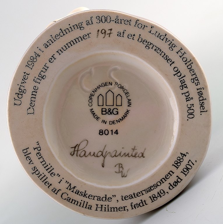 Figuren forestiller Camilla Hilmer i rollen som Pernille i komedien Maskerade, opført på Det kongelige Teater 1884-85. Holberg-samlingen er fremstillet i anledningen af 300-året for Ludvig Holbergs fødsel 1684.