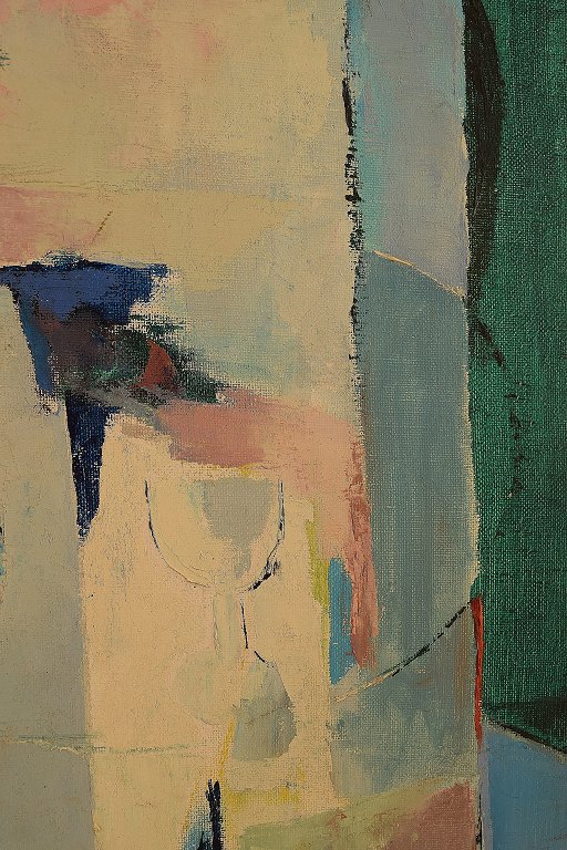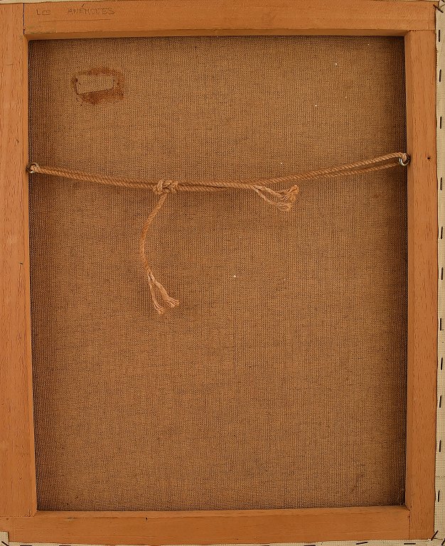 Ray Letellier, fransk kunstner "Les Anémones". Stilleben med blomster i vase og vinglas, olie pĺ lćrred. I god stand. Signeret, ca. 1960´erne. Mĺler 48 x 36 cm. Uden ramme.