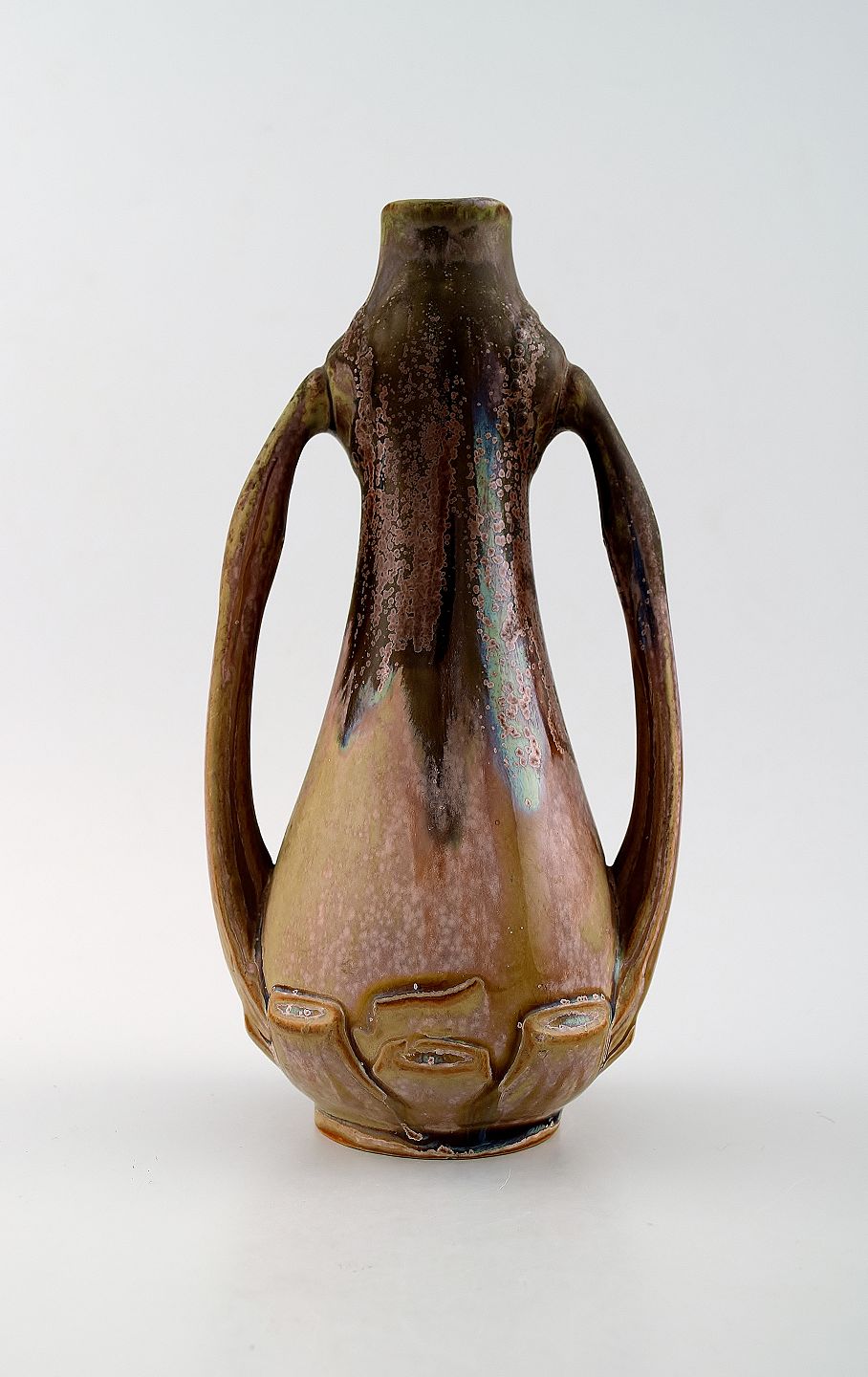 Fransk skønvirke keramikvase, Denbac (1909-1952) fremstillet i Vierzon. Ca. 1920´erne. Stemplet. Smuk polykrom glasur. Måler 23 cm. x 12 cm. I perfekt stand.