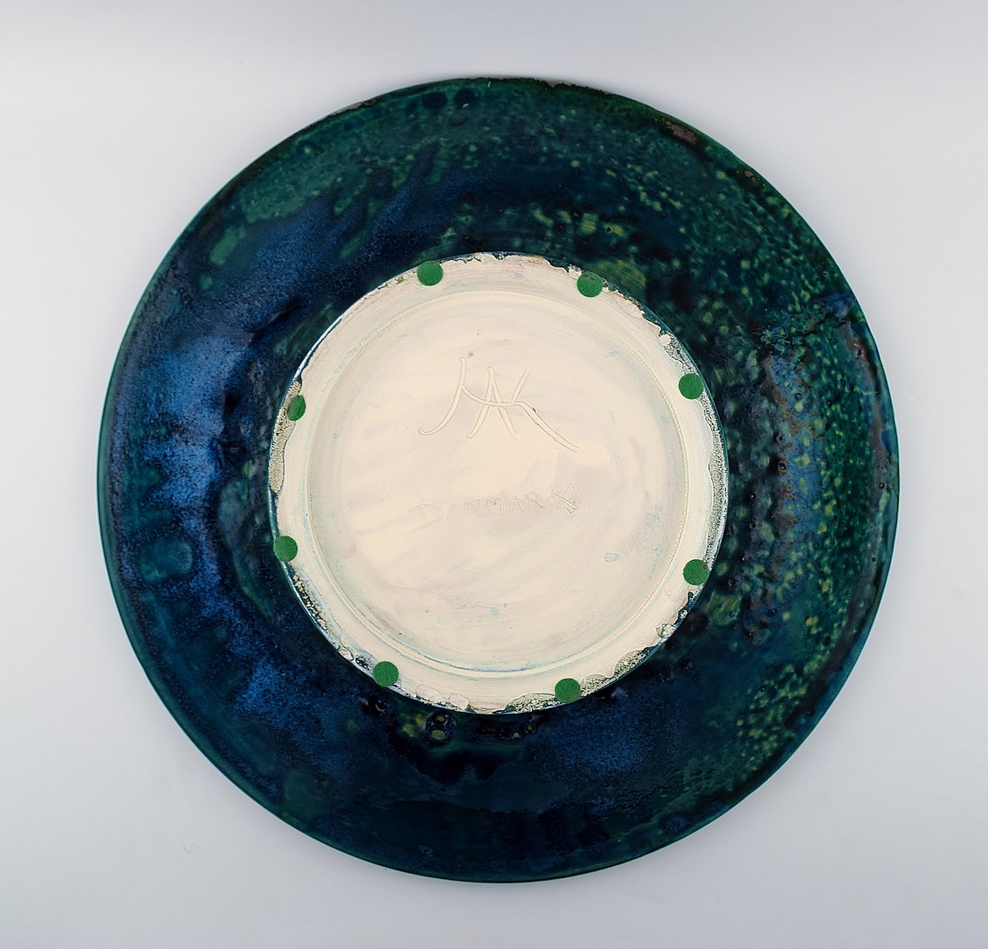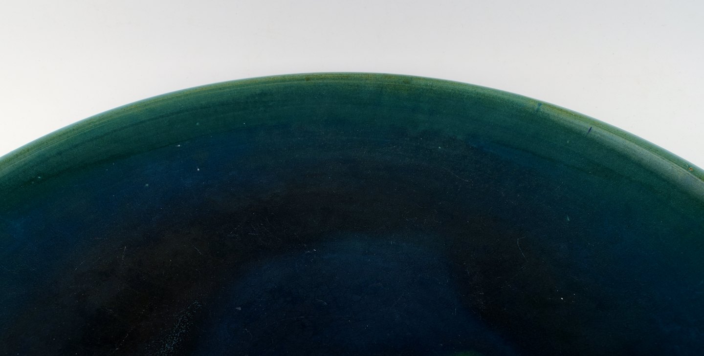 Kähler, HAK, kolossalt glaseret stentøjsfad, 1940/50'erne. Petroleumsblå glasur. Måler 51 cm. 8 cm. højt. Stemplet. I perfekt stand.