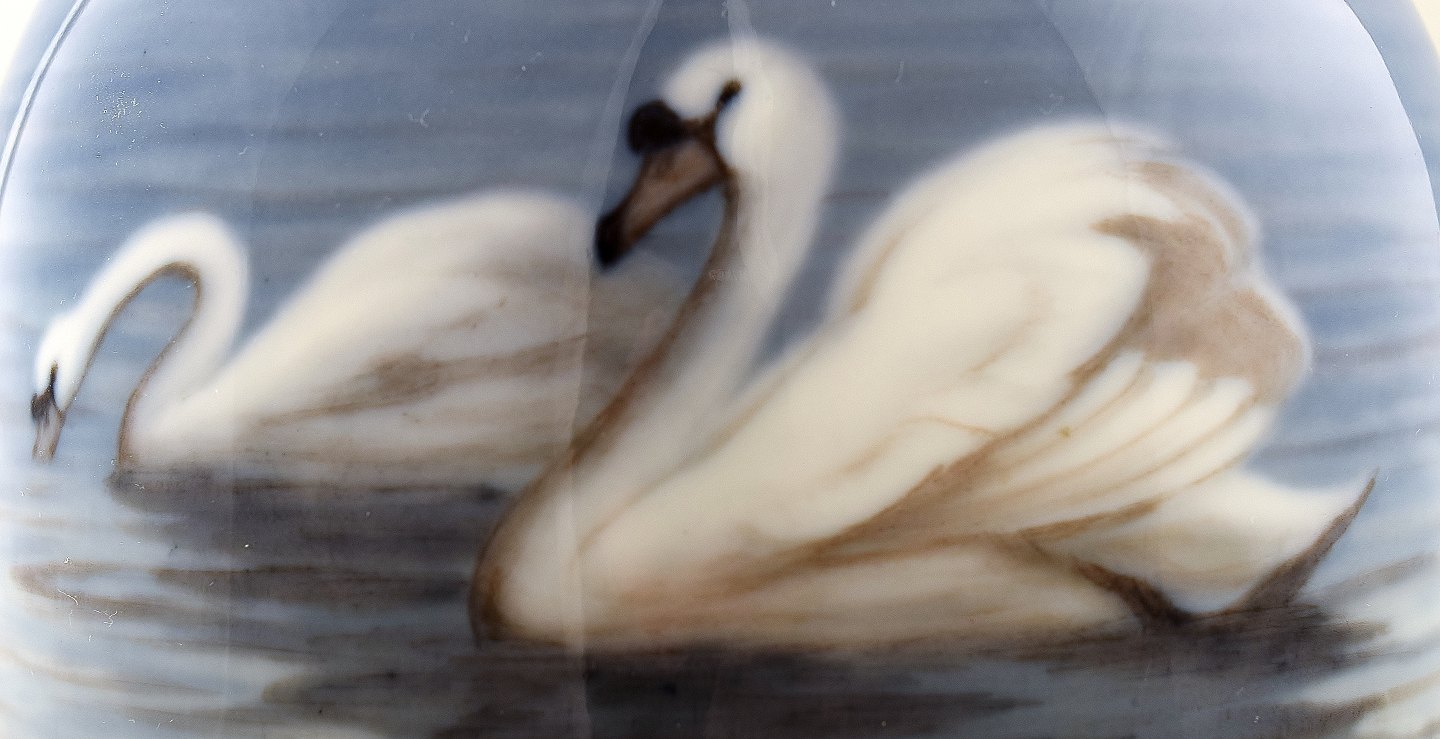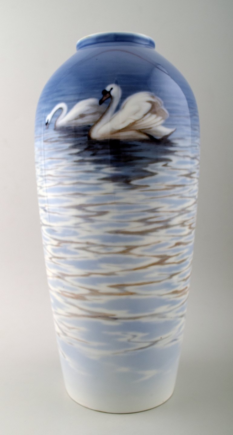 Margrethe Hyldahl (1881-1963) Stor flot vase af porcelæn, B&G, Bing & Grøndahl, dekoreret med svaner. Stemplet : MH, 4786/14 Måler : 38 cm. x 15 cm. 1. sortering, i perfekt stand.