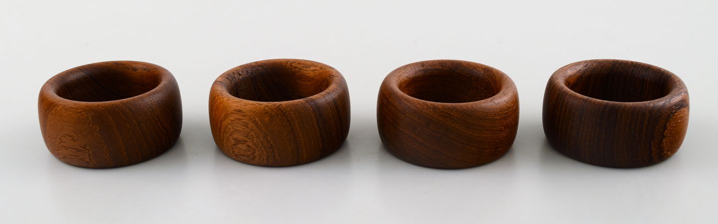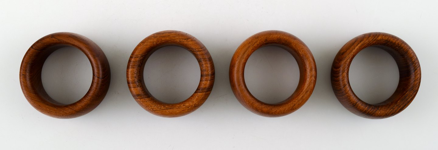 Kay Bojesen 4 servietringe i teak. Dansk design 50´erne. I perfekt stand. Måler : 5 cm. x 2 cm. Utydeligt stempelt.