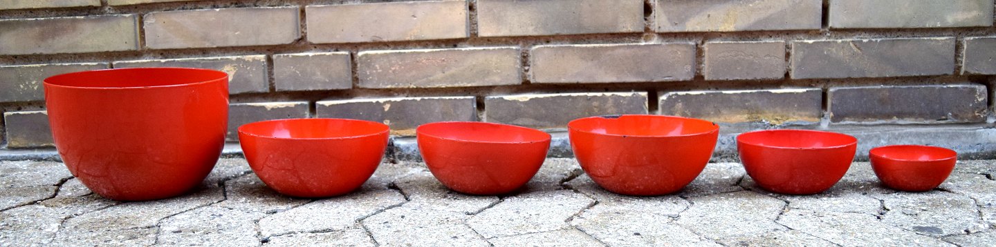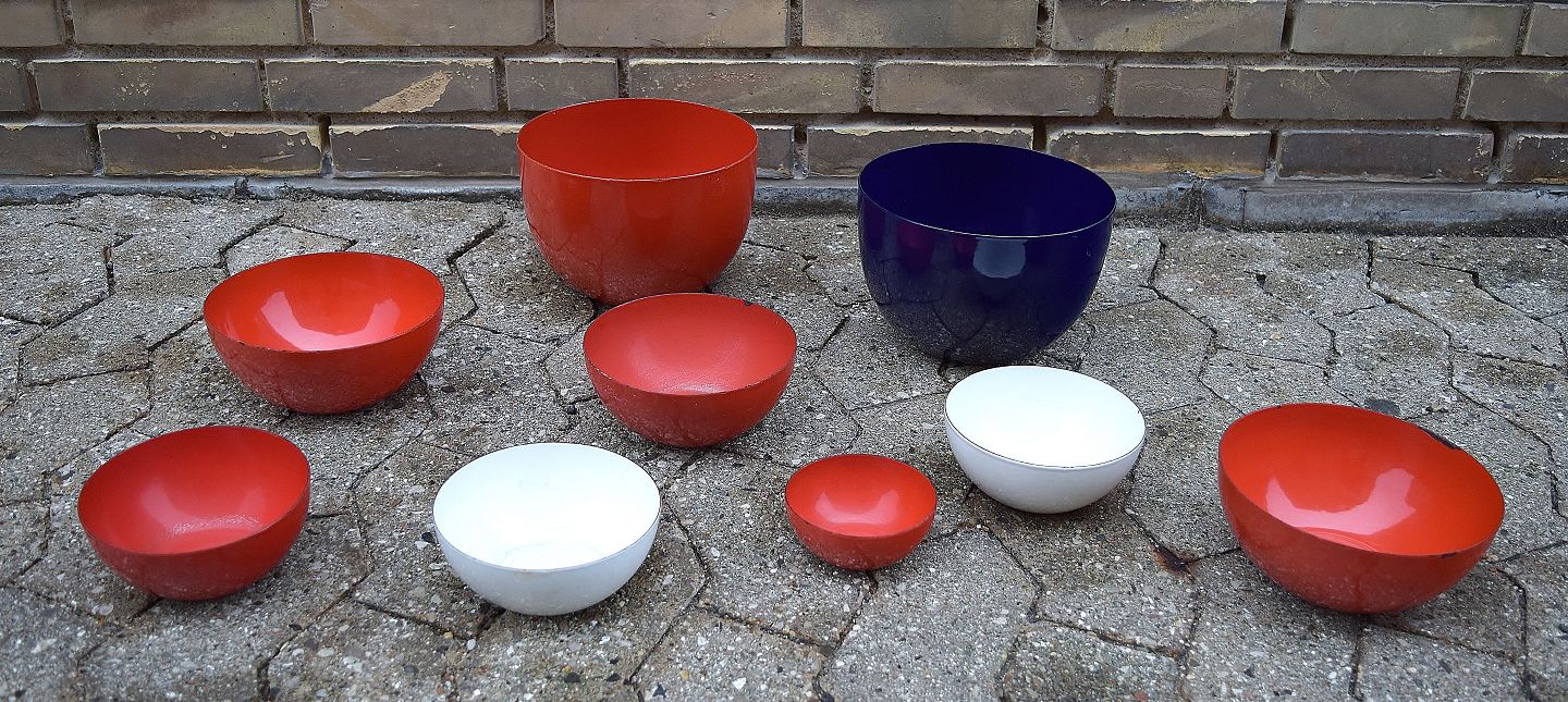KAJ FRANCK 9 skåle, emaljeret metal, Finel, Finland, 1950´erne. Røde, blå og hvide. Diameter 10-24 cm. Højde 5-14 cm. I god stand, mindre brugspræg. Stemplet.