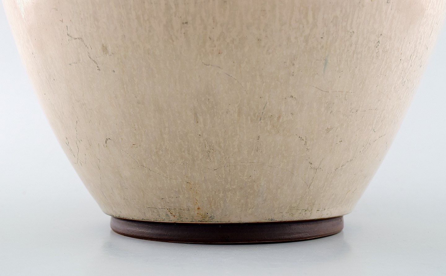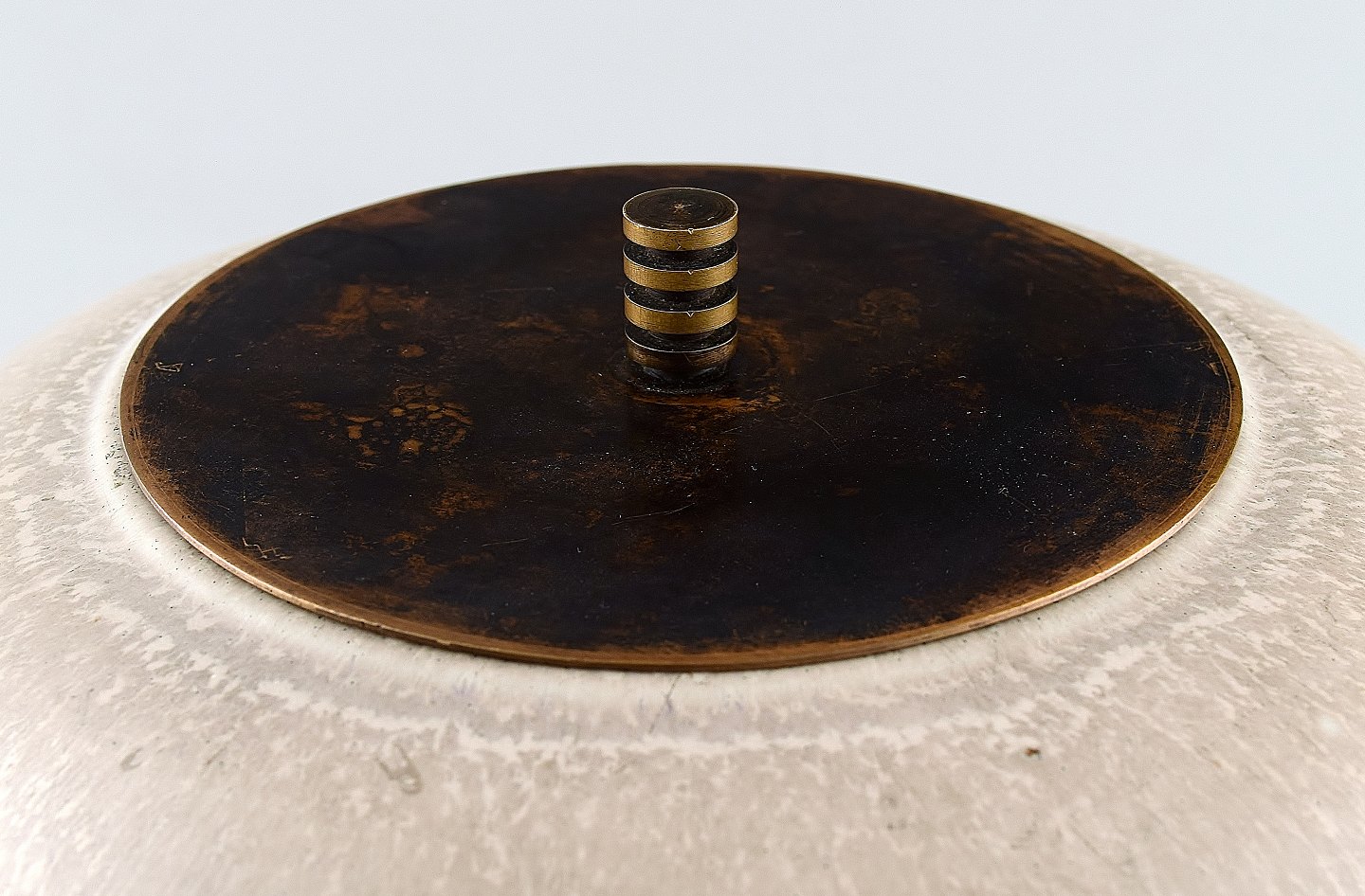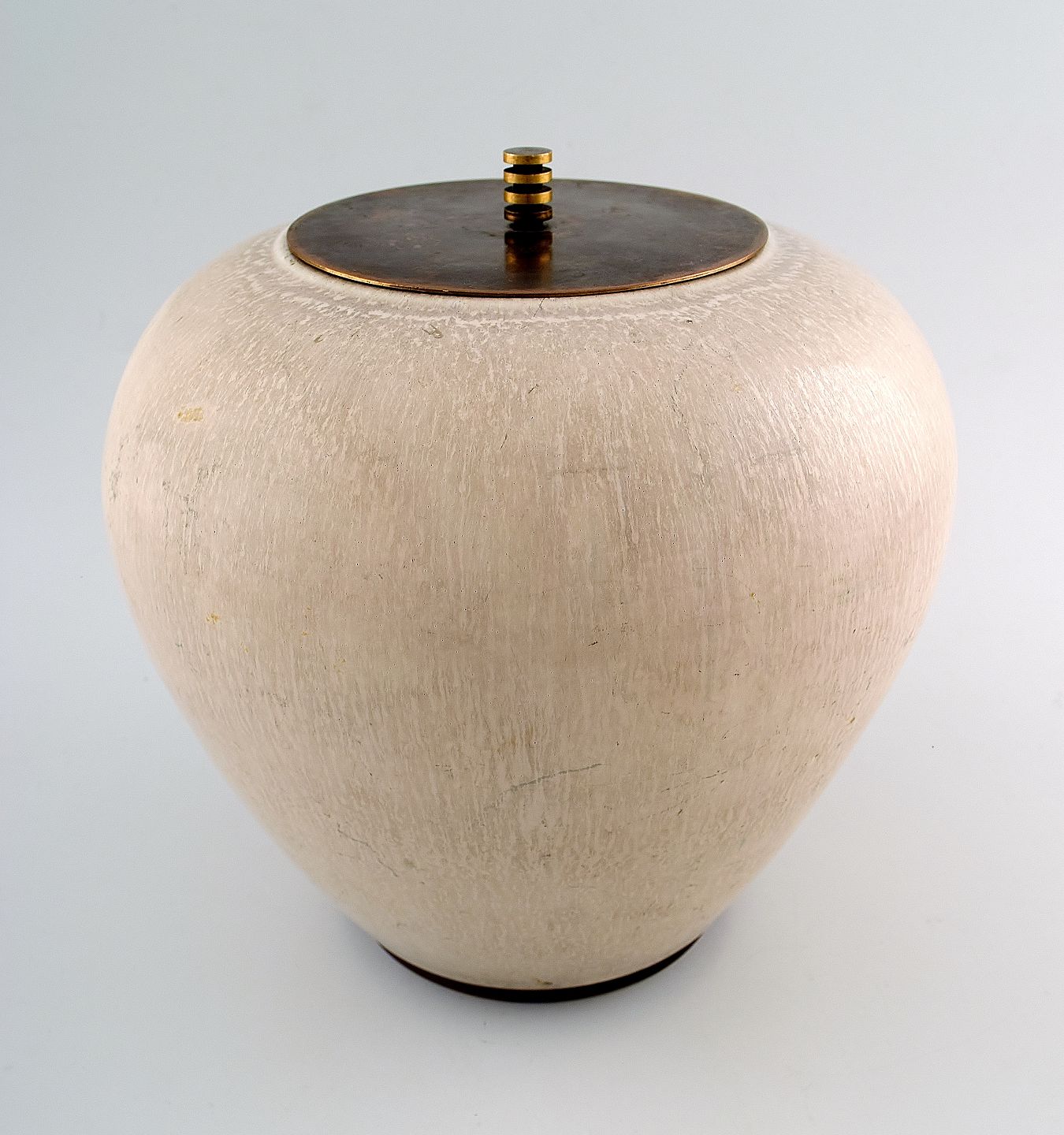 Stor Saxbo vase af stentøj med tilhørende bronzelåg, dekoreret med smuk æggeskalsglasur.