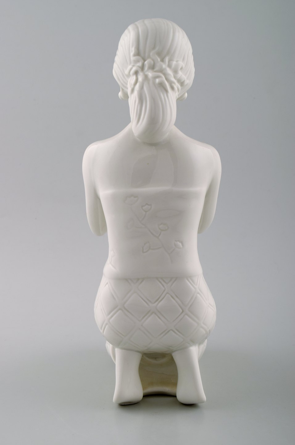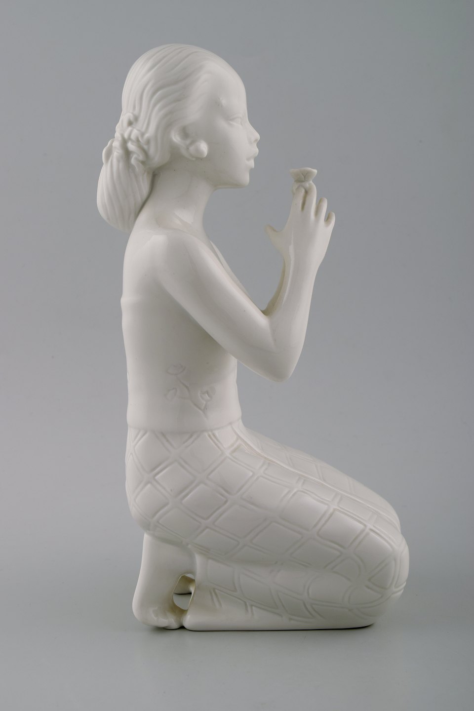 Harald Salomon for Rörstrand, hvidglaseret figur forestillende balineser holdende blomst i hånden.