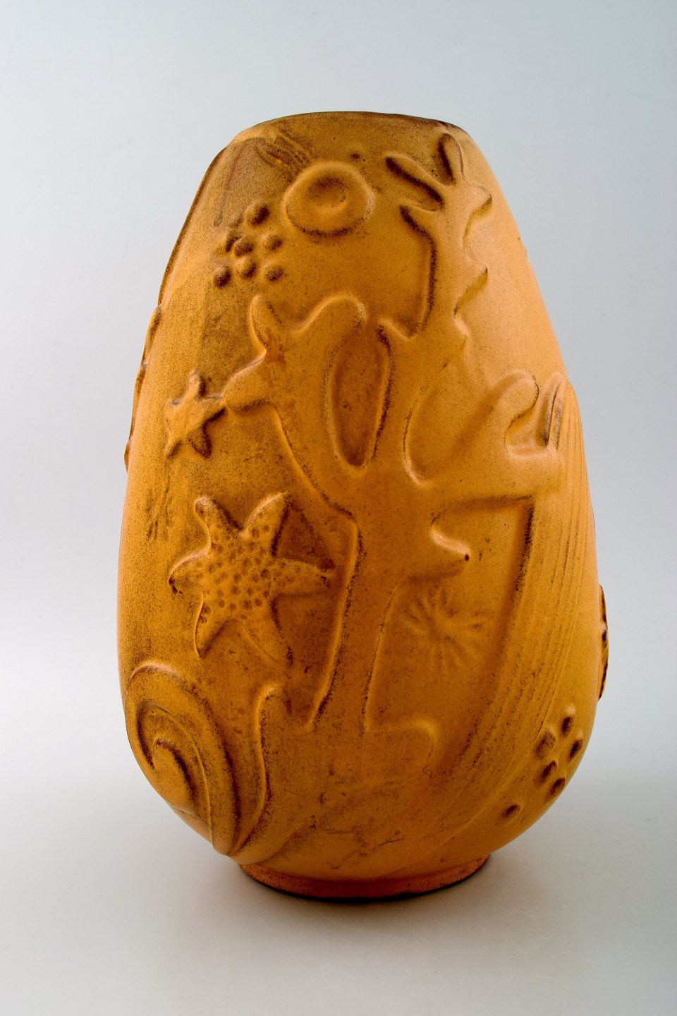 Mari Simmulson for Upsala-Ekeby keramikvase. Fisk i relief. Smuk glasur i gule nuancer. I perfekt stand. 1960´erne. Måler 27 x 17 cm. Stemplet.