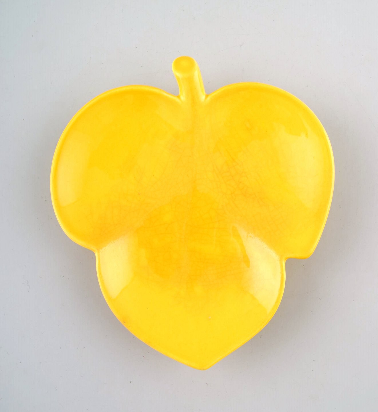 2 bladformede fade, Susanne Gul Confetti Royal Copenhagen/ Aluminia fajance. Måler: Største : 18 cm. x 18 cm. I god stand. Lille fad med lille skår på bagside. 1. sortering.