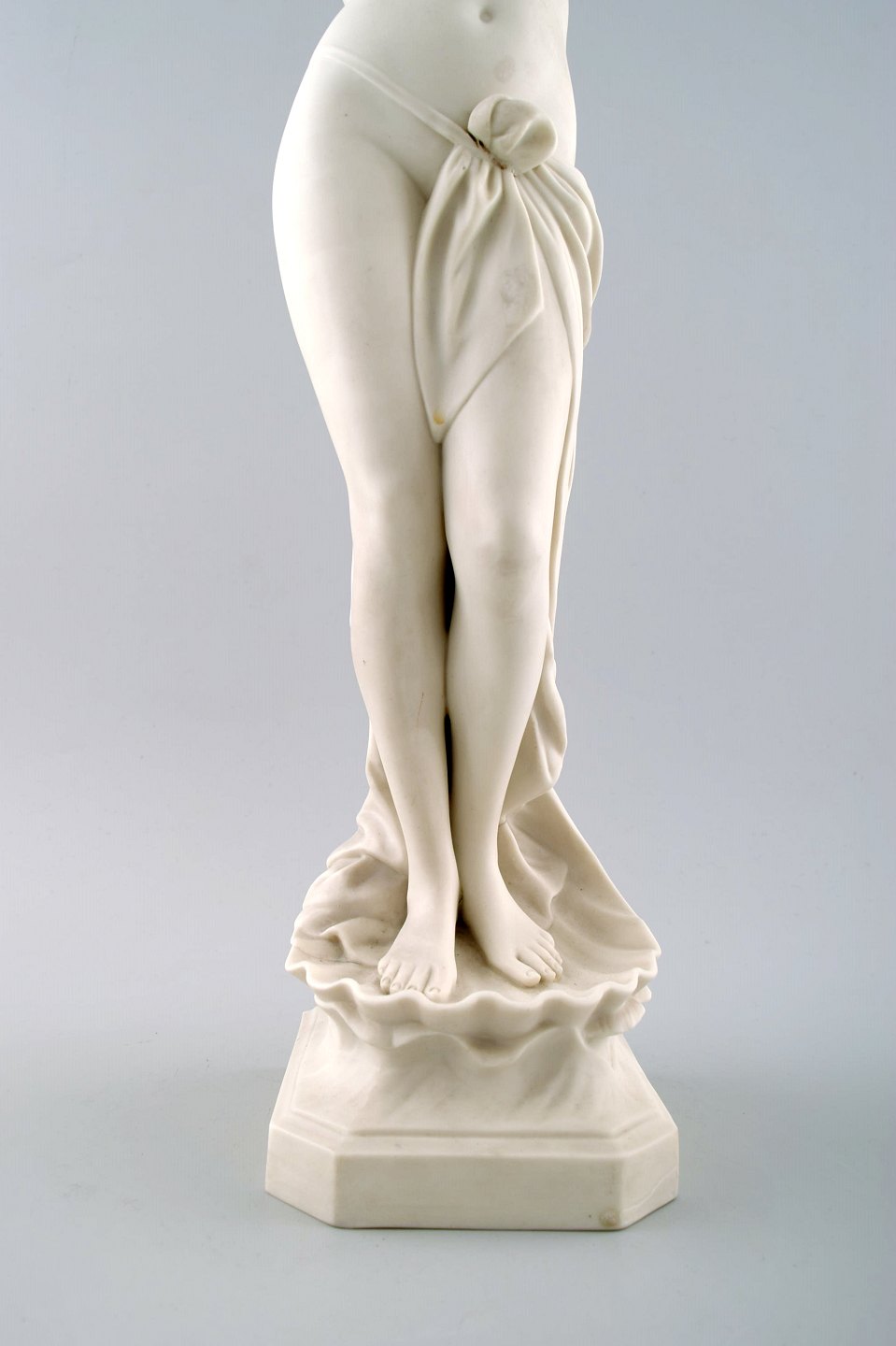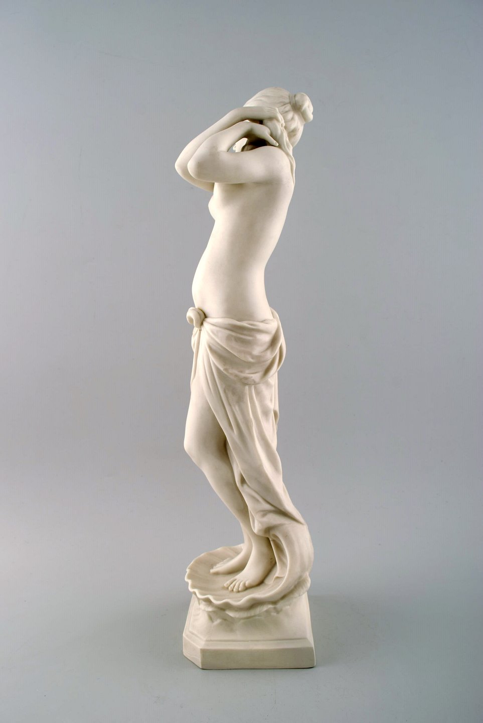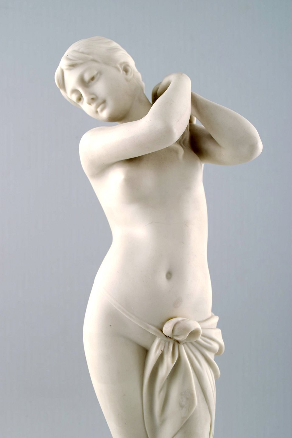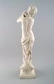Skulptur i biscuit på sokkel, Gustavsberg, 1907. Klassisk skulptur af halvnøgen kvinde. Måler 46 cm. I perfekt stand.
