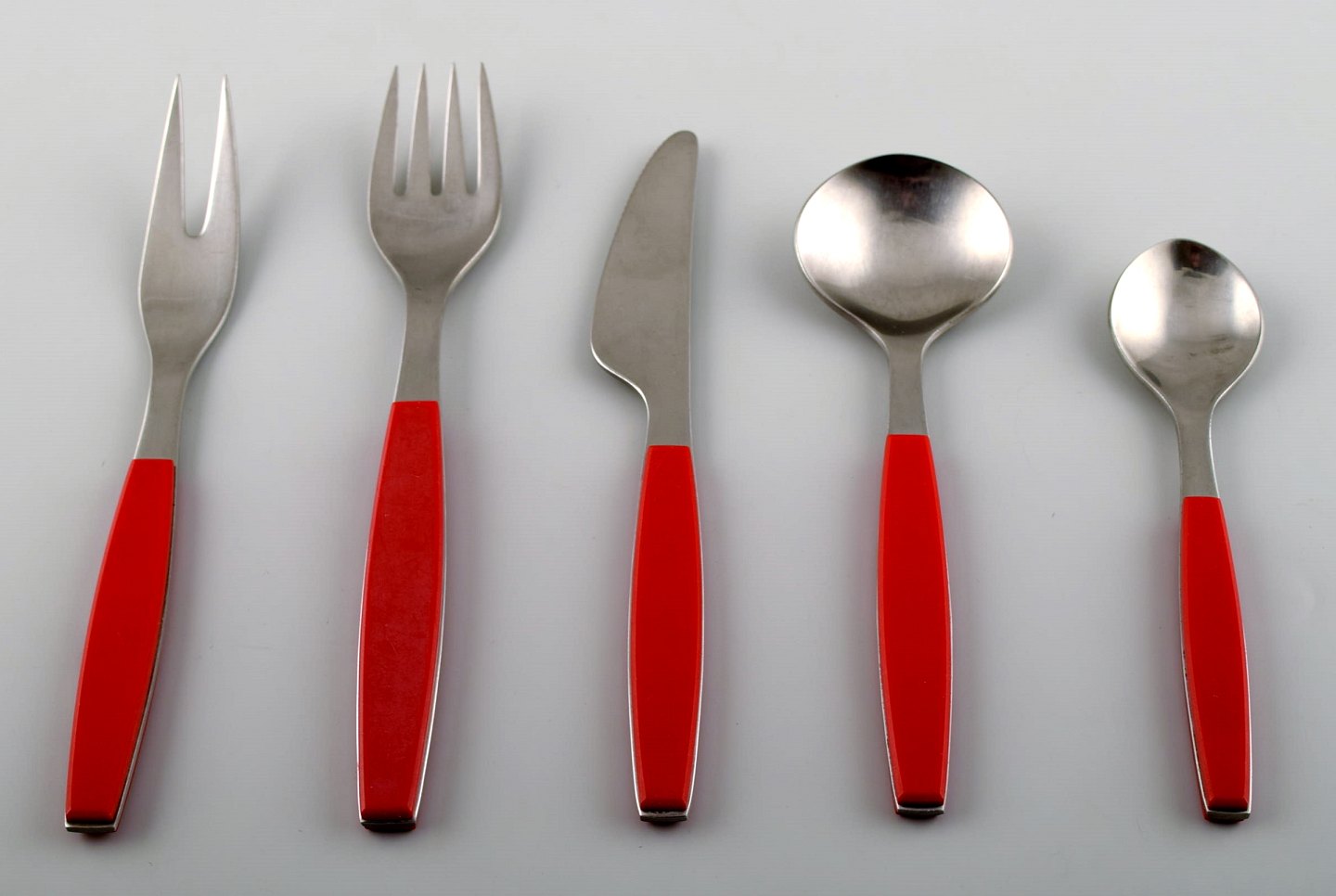 Komplet service til 6 p., Henning Koppel. Strata bestik af rustfrit stål og rød plast. Fremstillet hos Georg Jensen.
