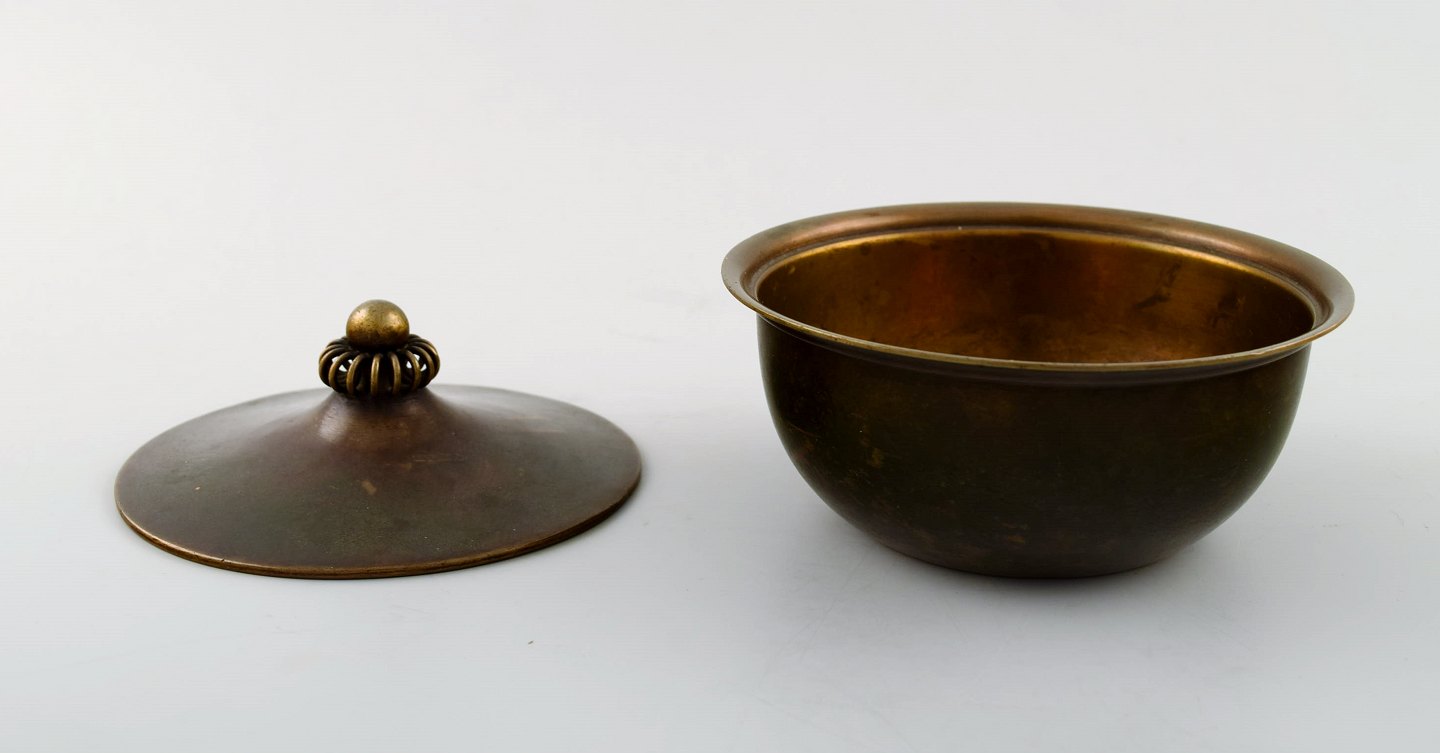 Just Andersen art deco æske/smykkeskrin/boks i letbronze. Stemplet LB 1615. Fremstår i flot stand, smuk patina. Måler 10 cm. x 8,5 cm.