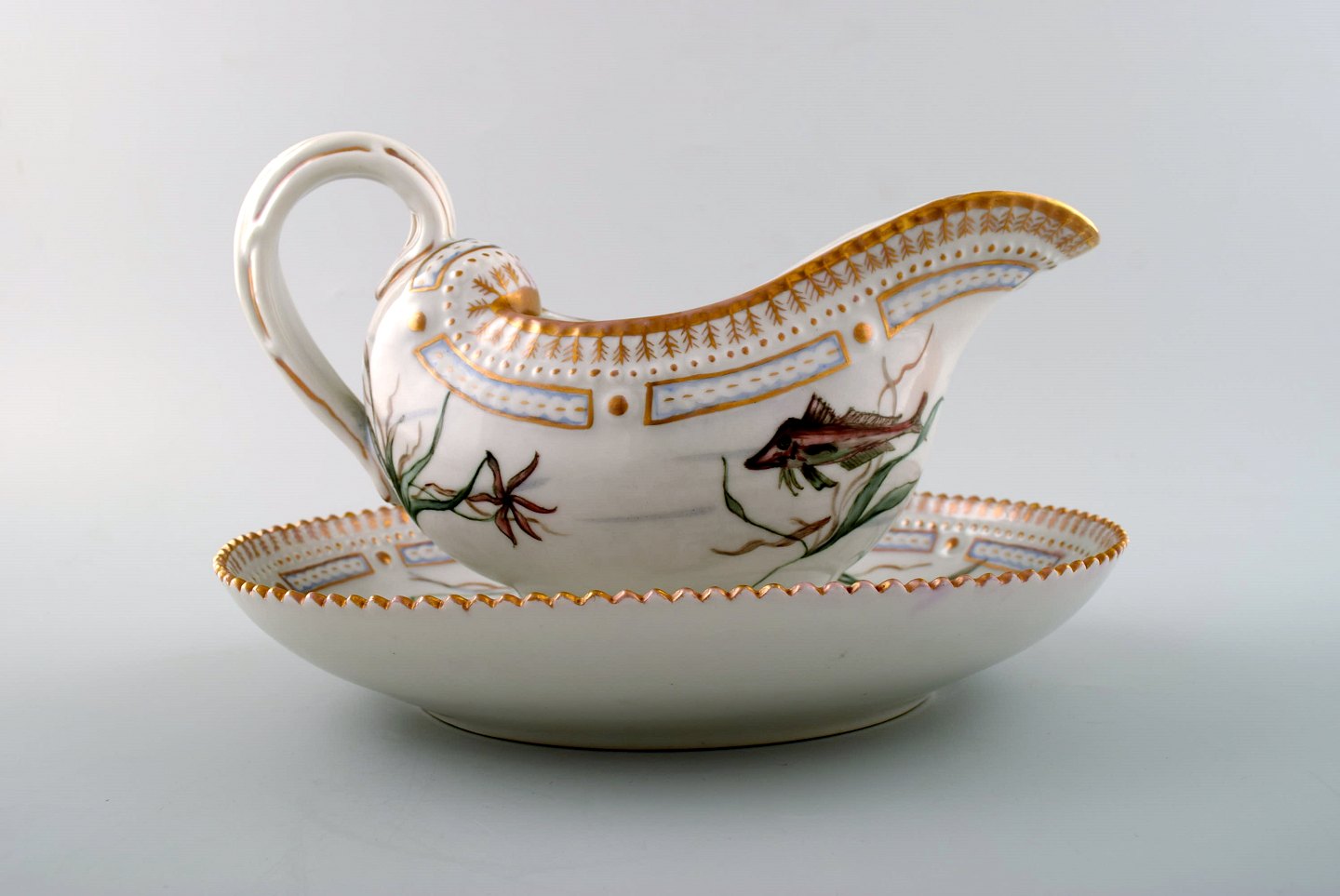 Sjælden Royal Copenhagen Kongelig porcelæn Flora Danica/Fauna danica saucekande/sovsekande, håndmalet med fisk. Højde 14 cm. Længde 23 cm. I perfekt stand. 2. sortering. Dateret 1930.