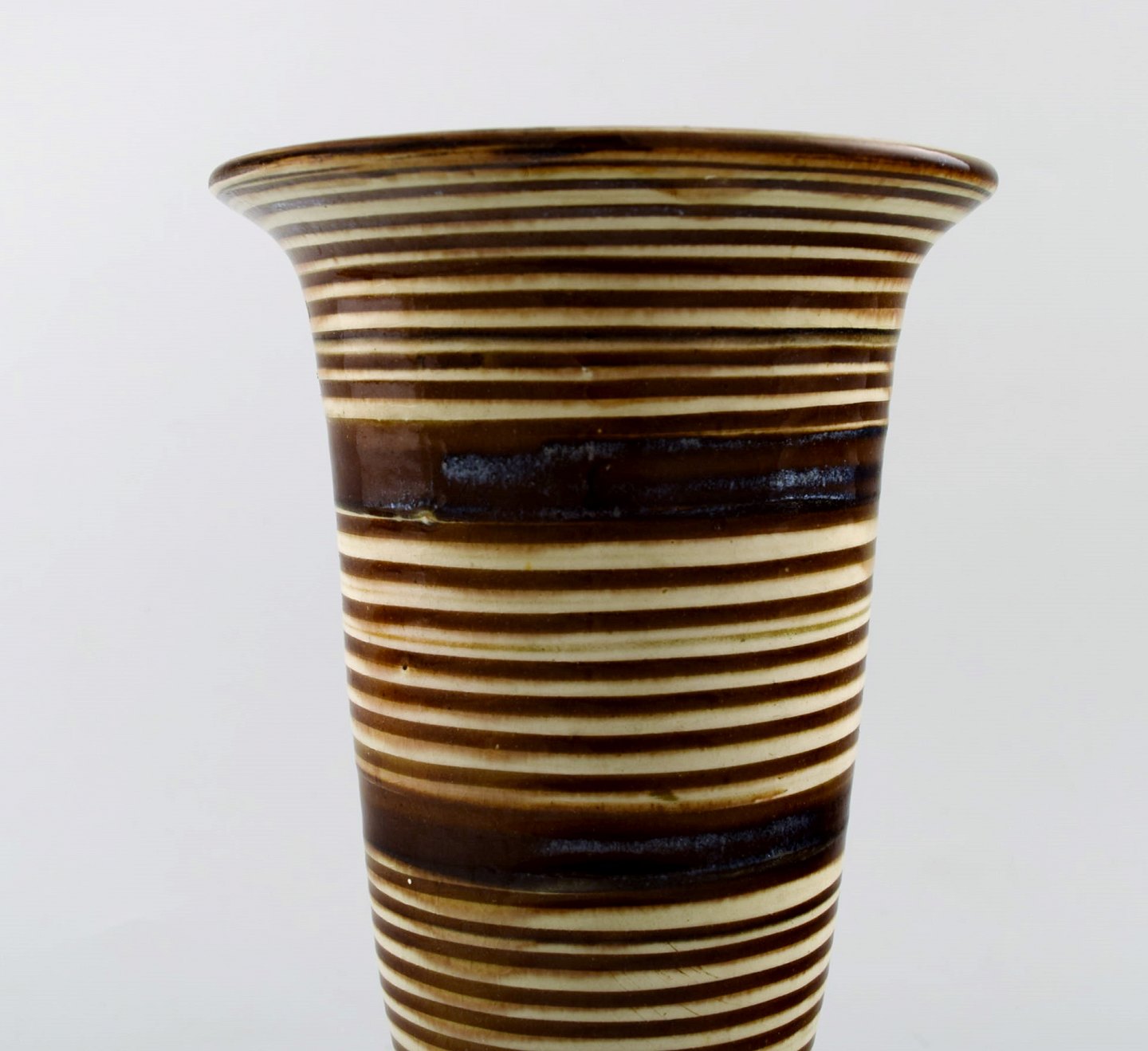 Kähler, HAK, glaseret stentøjsvase med striber på rund fod. Glasur i brune nuancer. 1930/40´erne. Stemplet. Måler : 22 cm. x 12,5 cm. I perfekt stand.