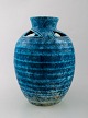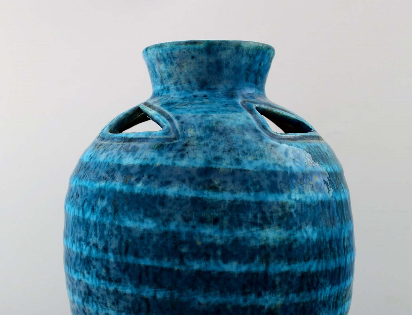 Accolay, Fransk keramikvase. Turkis, stilrent design med striber. Stemplet. Modelnummer 27. 1960´erne. Smuk turkis glasur. Måler 24 cm. x 16 cm. I perfekt stand.
