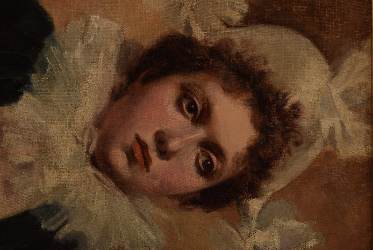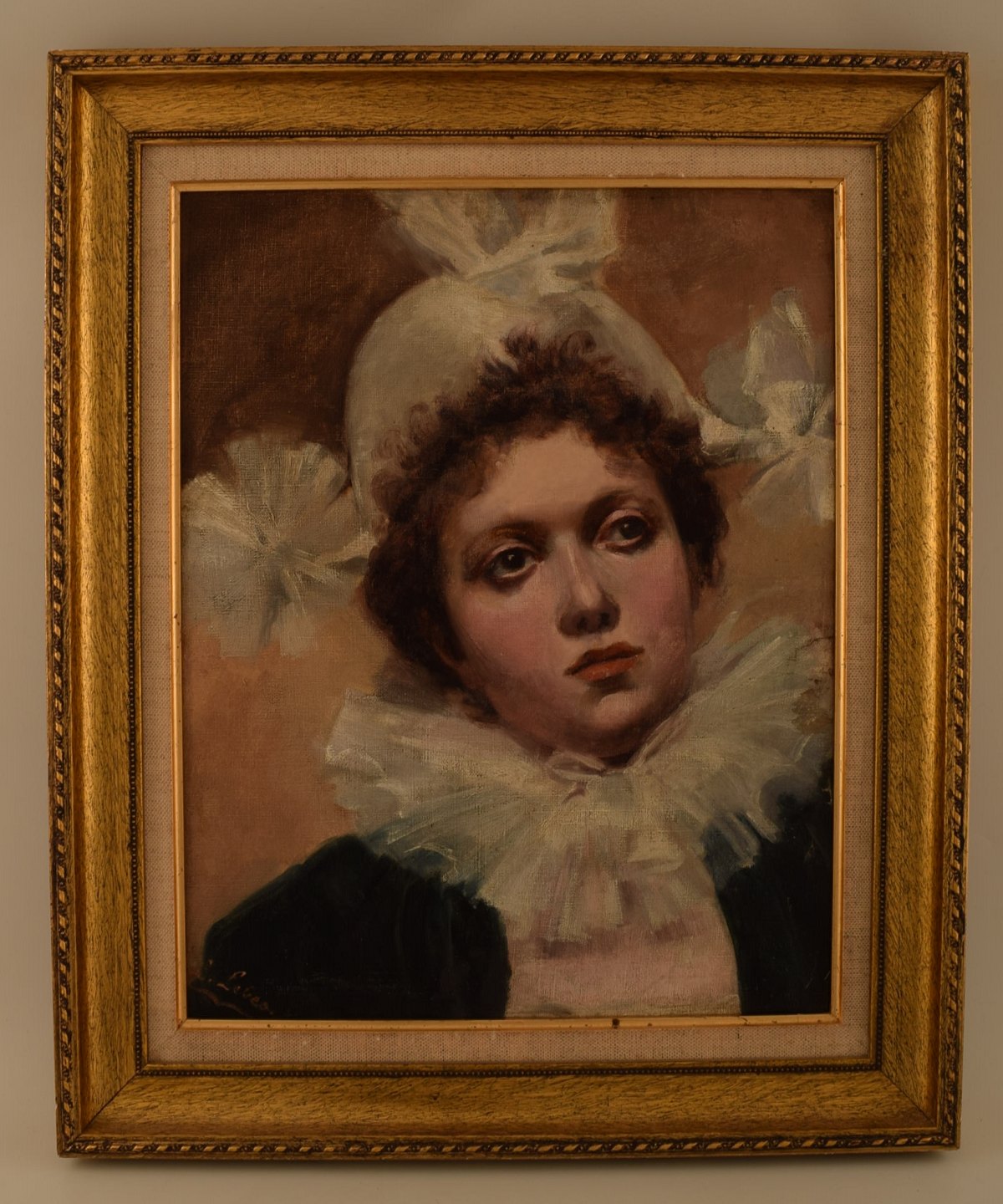 L. Lebeo, fransk kunstner, "La femme Pierrot" sent 1800-tallet. Olie på lærred. Signeret : L. Lebeo. Måler : 39 x 30 cm. Rammen måler 6 cm. I flot stand.