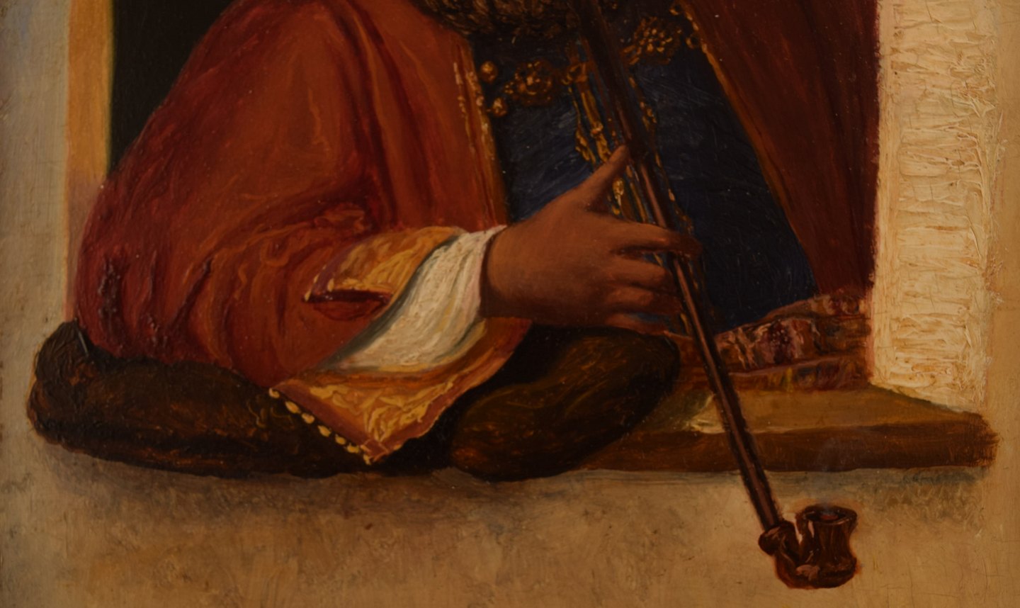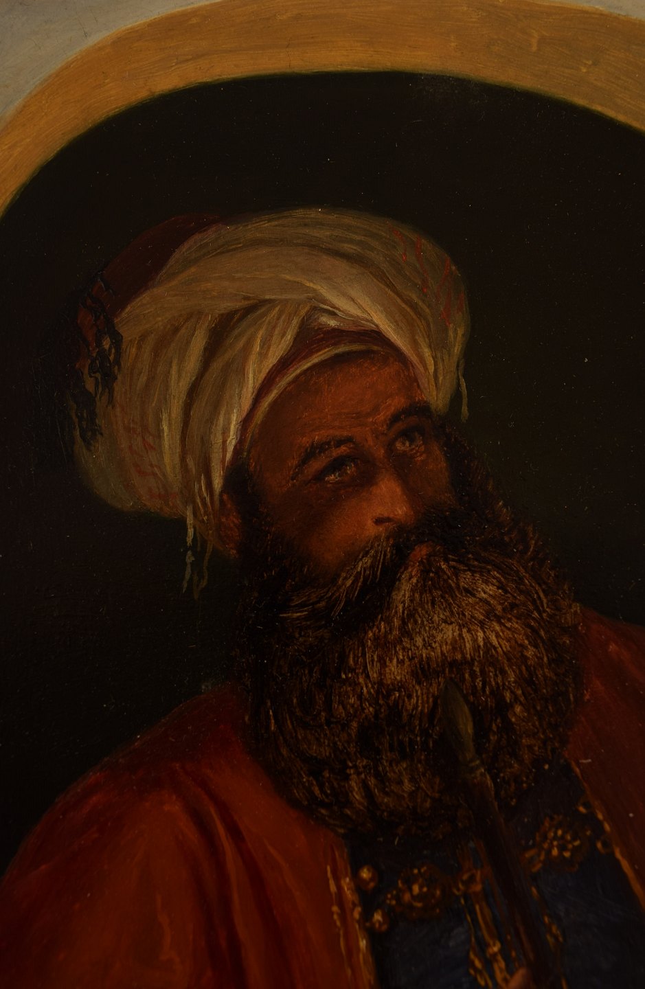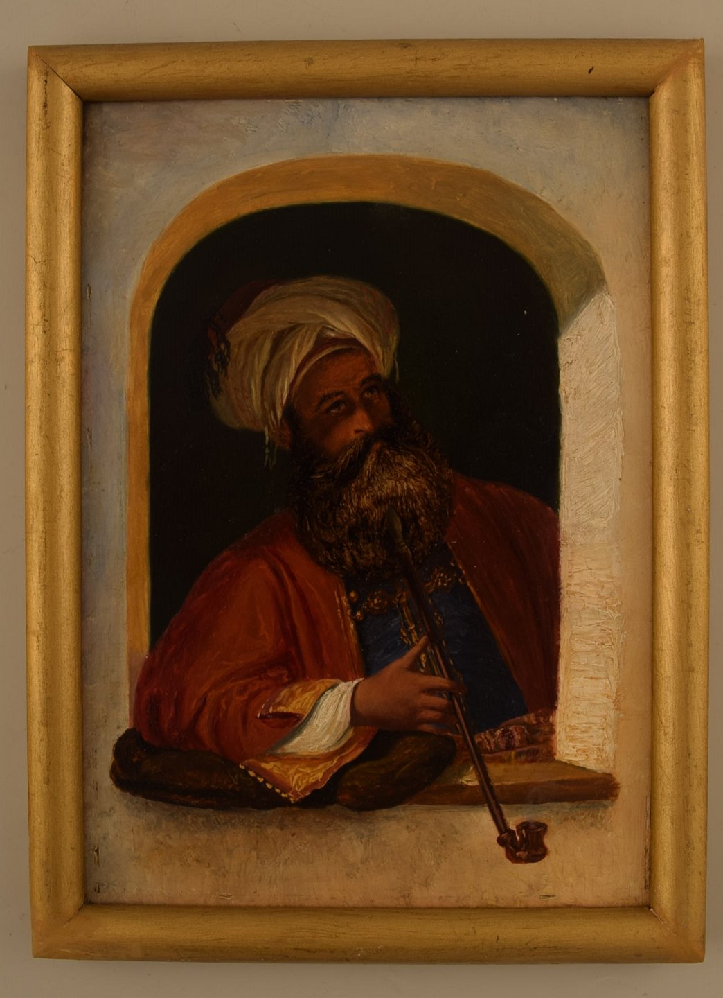Ubekendt maler, 19. årh. En piberygende tyrker med turban. Usigneret. Olie på træ. Måler 21 cm. x 15 cm. Rammen måler 1,5 cm. I perfekt stand.