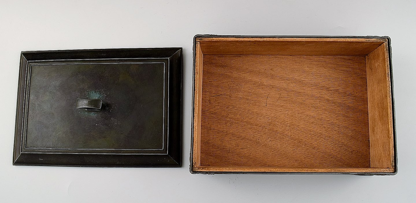Just Andersen disko metal skrin/æske, nummer D 1603. Stemplet. God stand, flot patina. Måler 35 cm. x 12 cm. x 10 cm. høj.