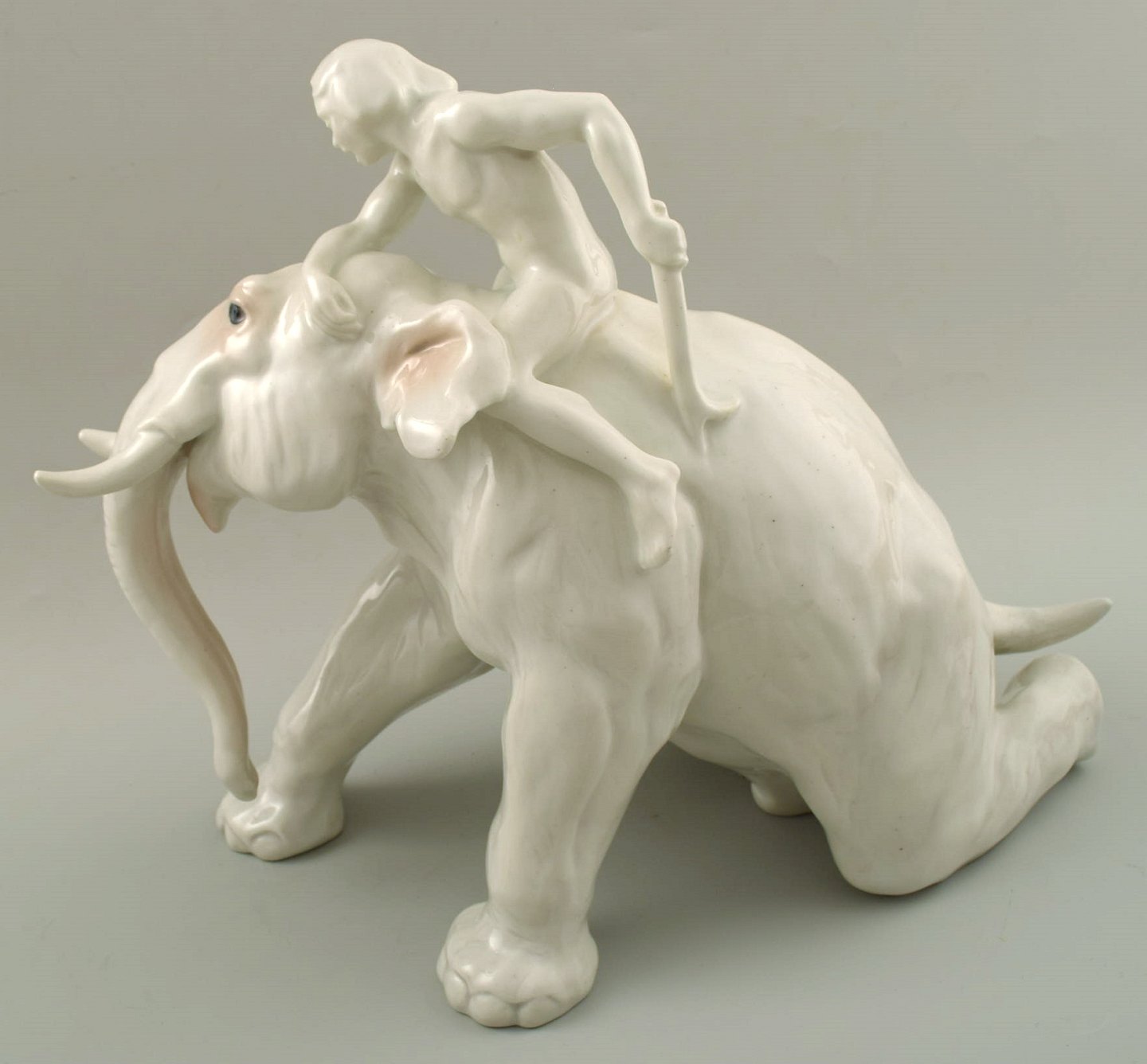 Sjælden Figurgruppe med mahout og elefant. Nummer 1858. Bing & Grøndahl. Måler : 33 cm. x 29 cm. I perfekt stand. 2. sortering.